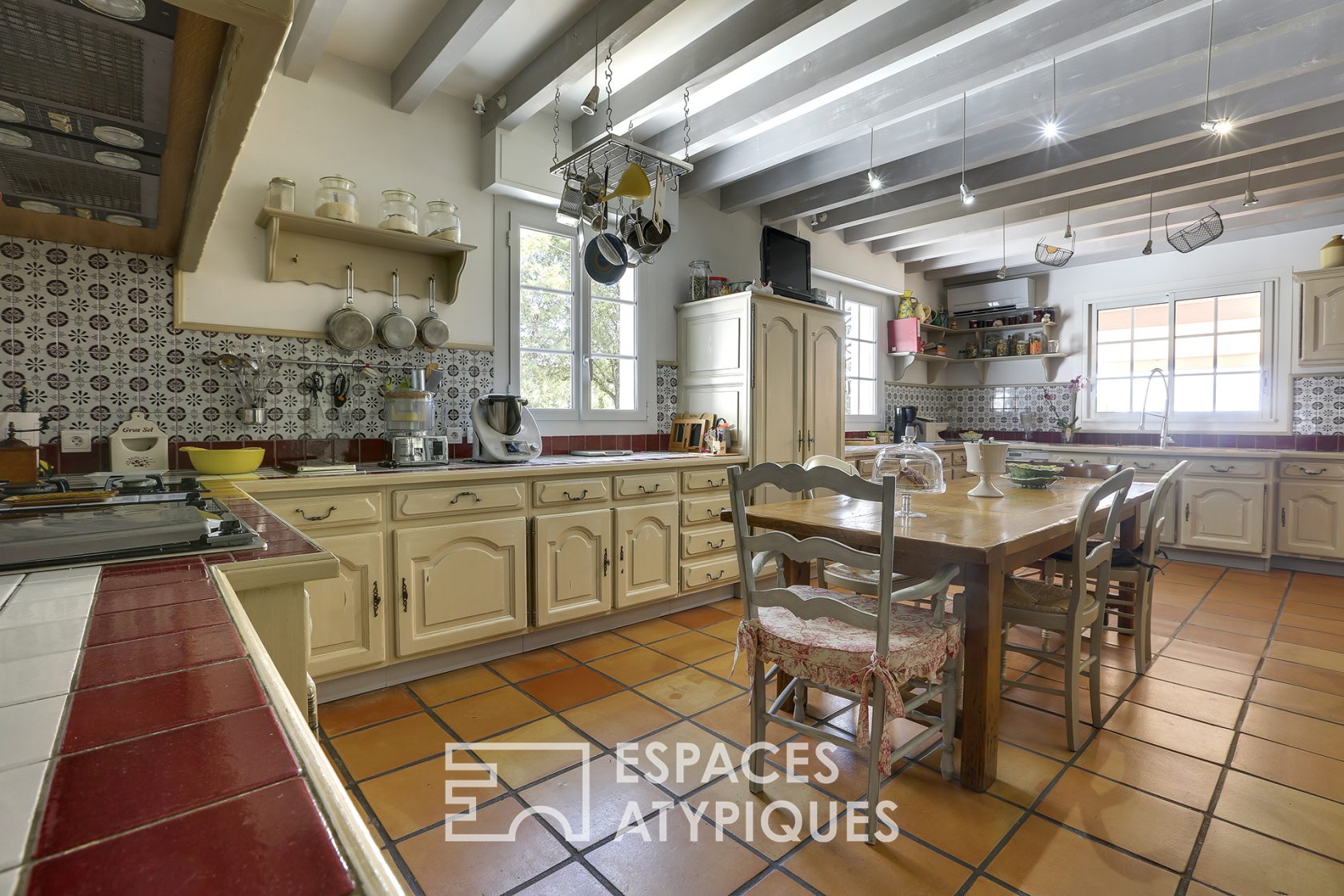 In the continuity a magnificent kitchen with non-standard dimensions allows to install an old-fashioned dining table. His scullery has all the necessary comfort. On this part, a workshop converted into a sewing room and its wooden workshop canopy offers a beautiful bright room.