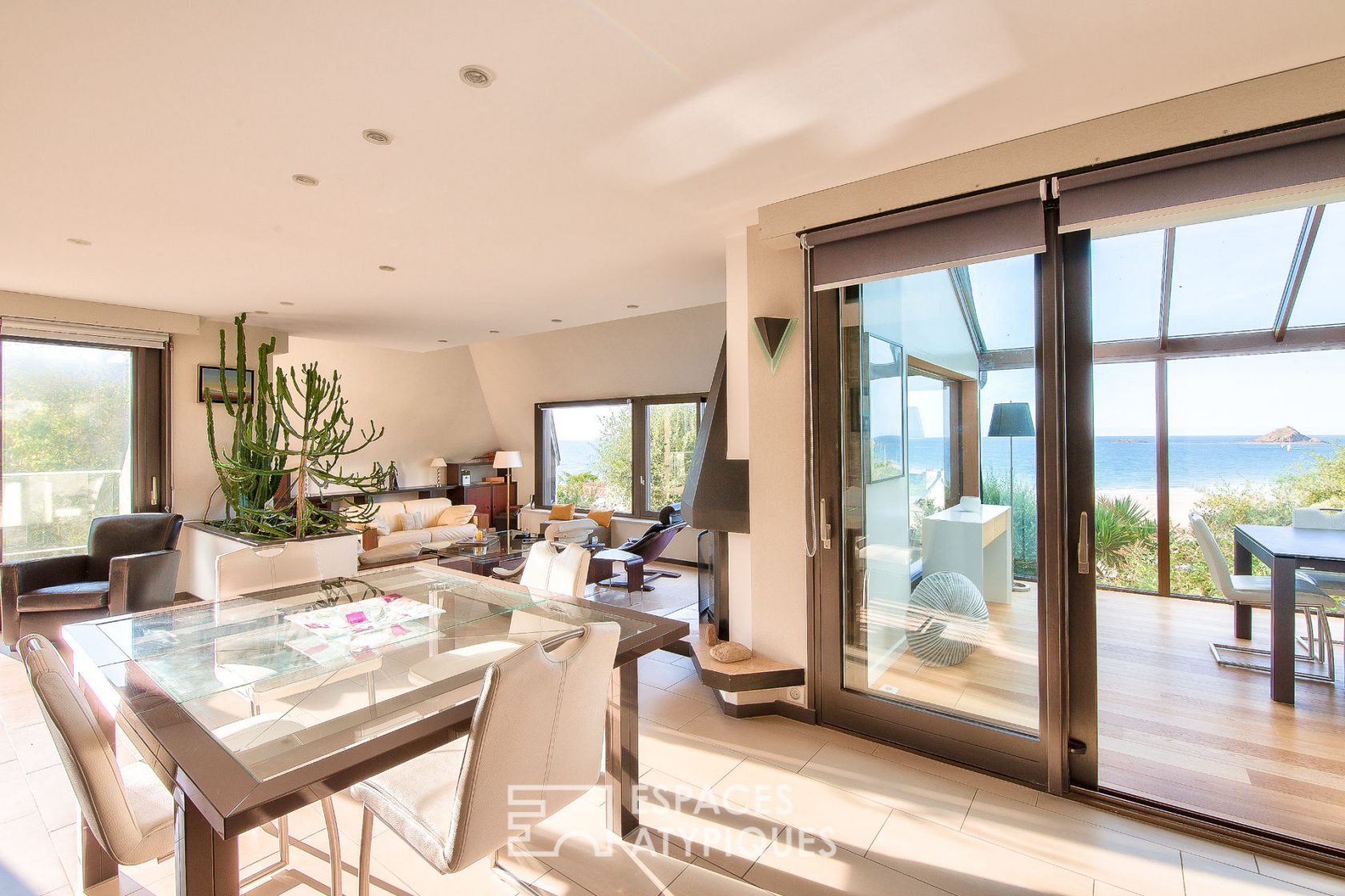 This contemporary 350sqm residence sits in the heart of the Val André seaside resort and offers a postcard-worthy seaside landscape. Located just 50 meters from the large 2 km long sandy beach, it enjoys a breathtaking view of the ornithological reserve of the islet of Verdelet.