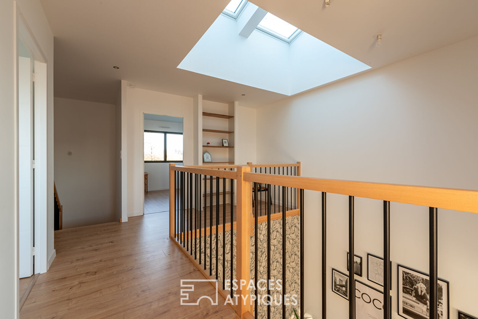 (lave-linge, sèche-linge, lave-vaisselle,cave à vins…équipement total). A l’étage, un large palier mezzanine dessert trois belles chambres, une salle de bain et un wc.