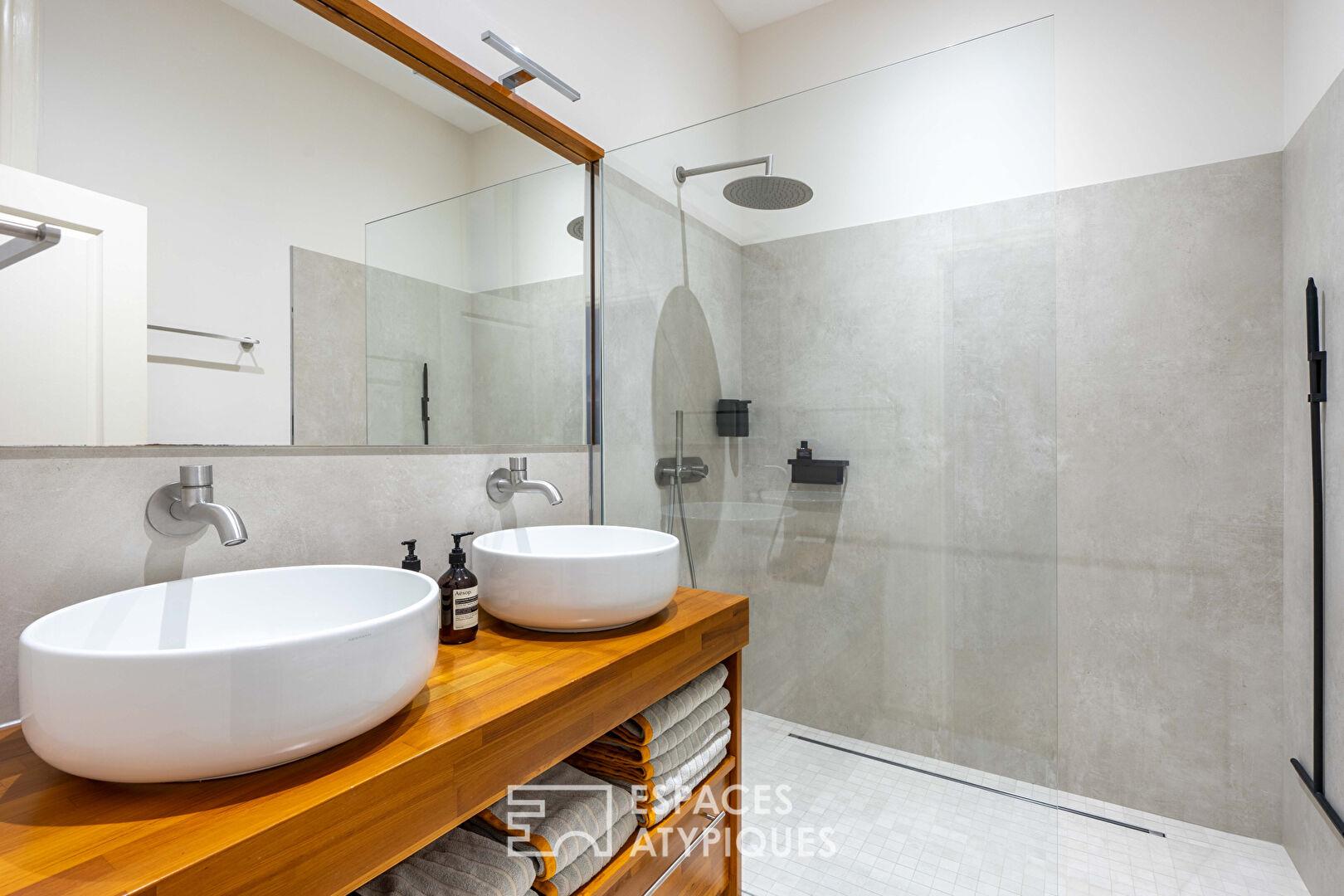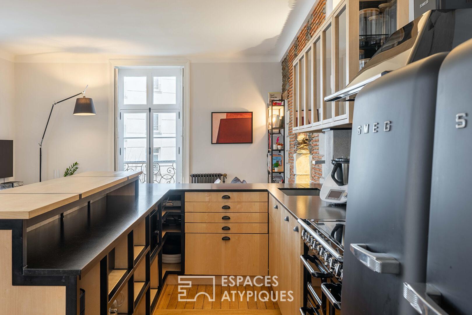 La pièce de vie, de belle taille, accueille notamment la cuisine équipée et aménagée. Un superbe piano de cuisson SMEG y trouve sa place. La salon, cosy et charmant, invite à la détente.
