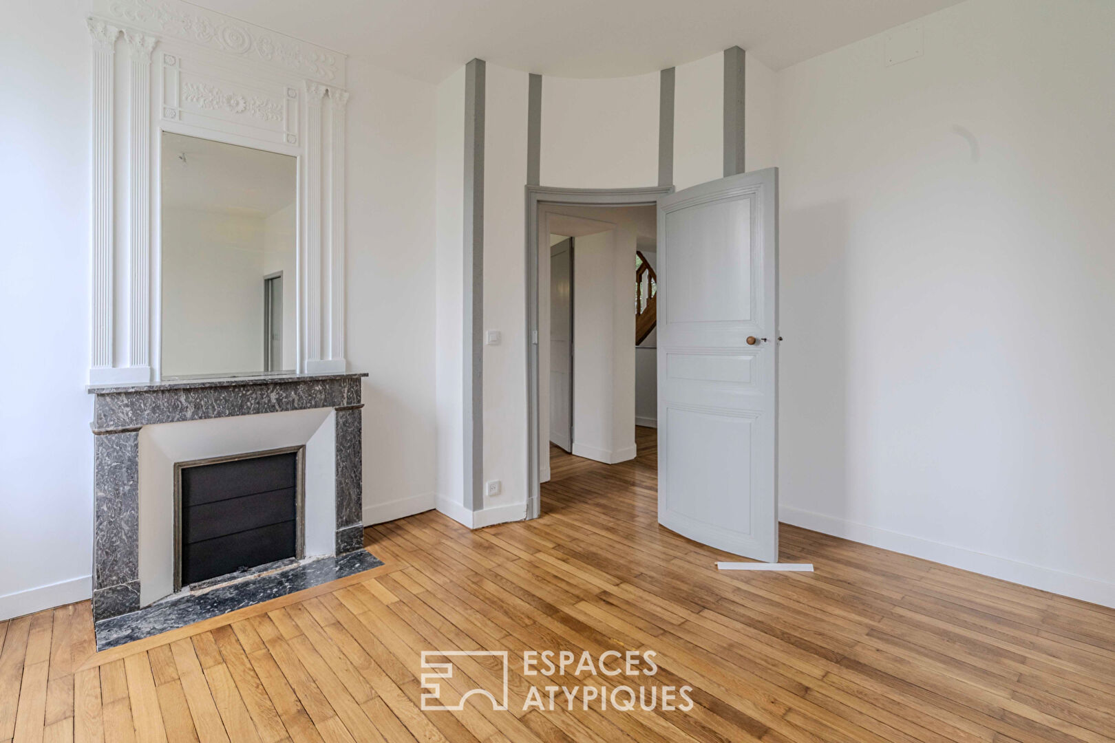 L’escalier en bois mène à l’étage ou se trouvent trois chambres sur parquet, avec de beaux éléments de décoration d’époque. Chaque chambre possède une salle d’eau. Un dressing complète la chambre parentale.