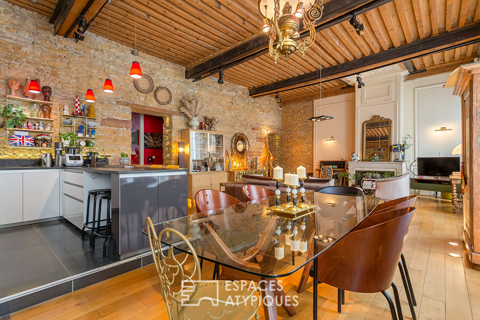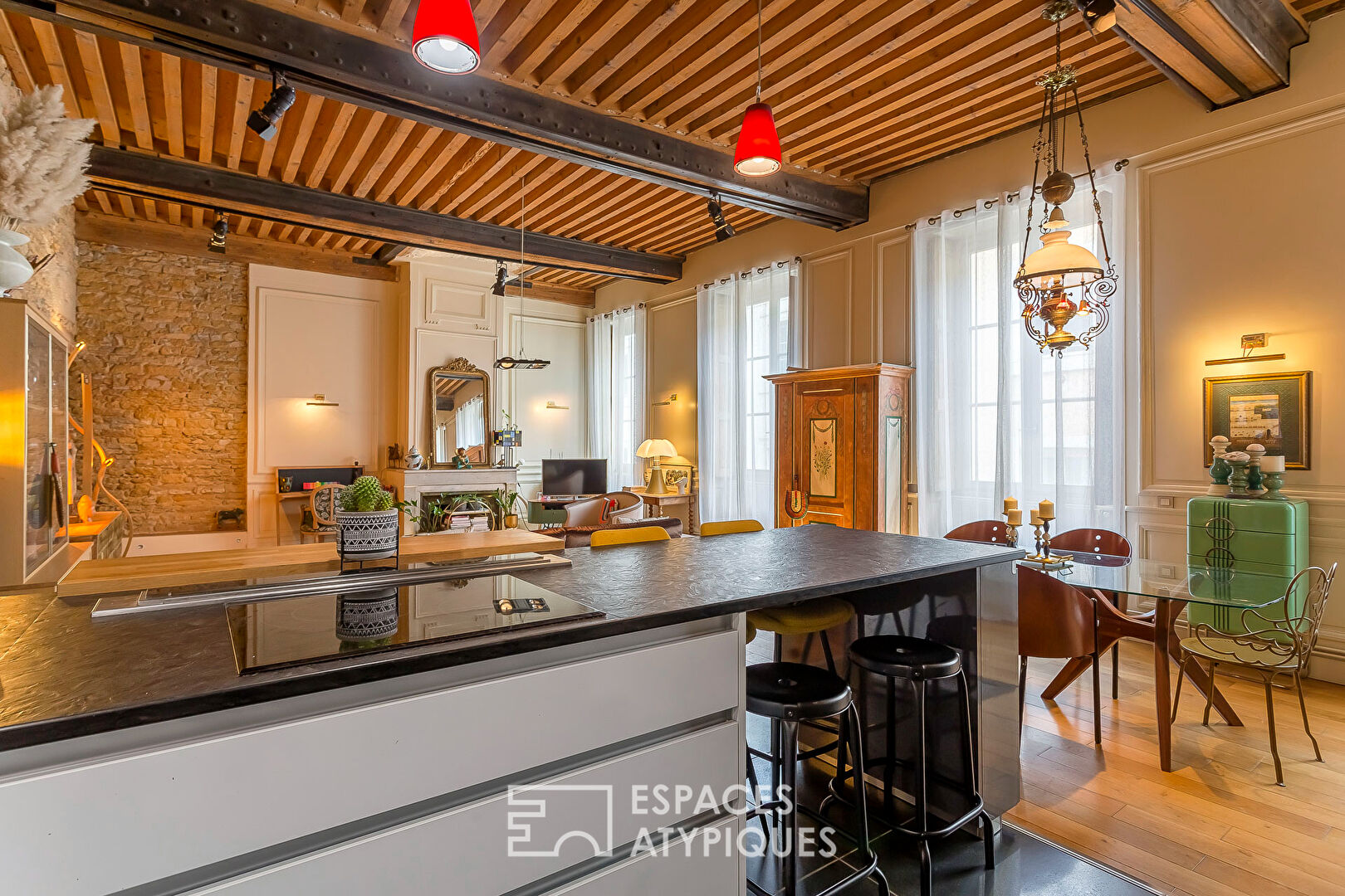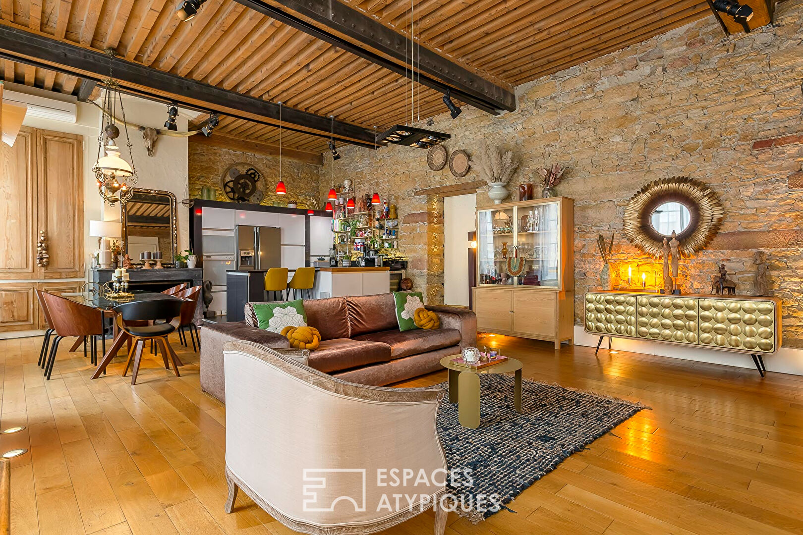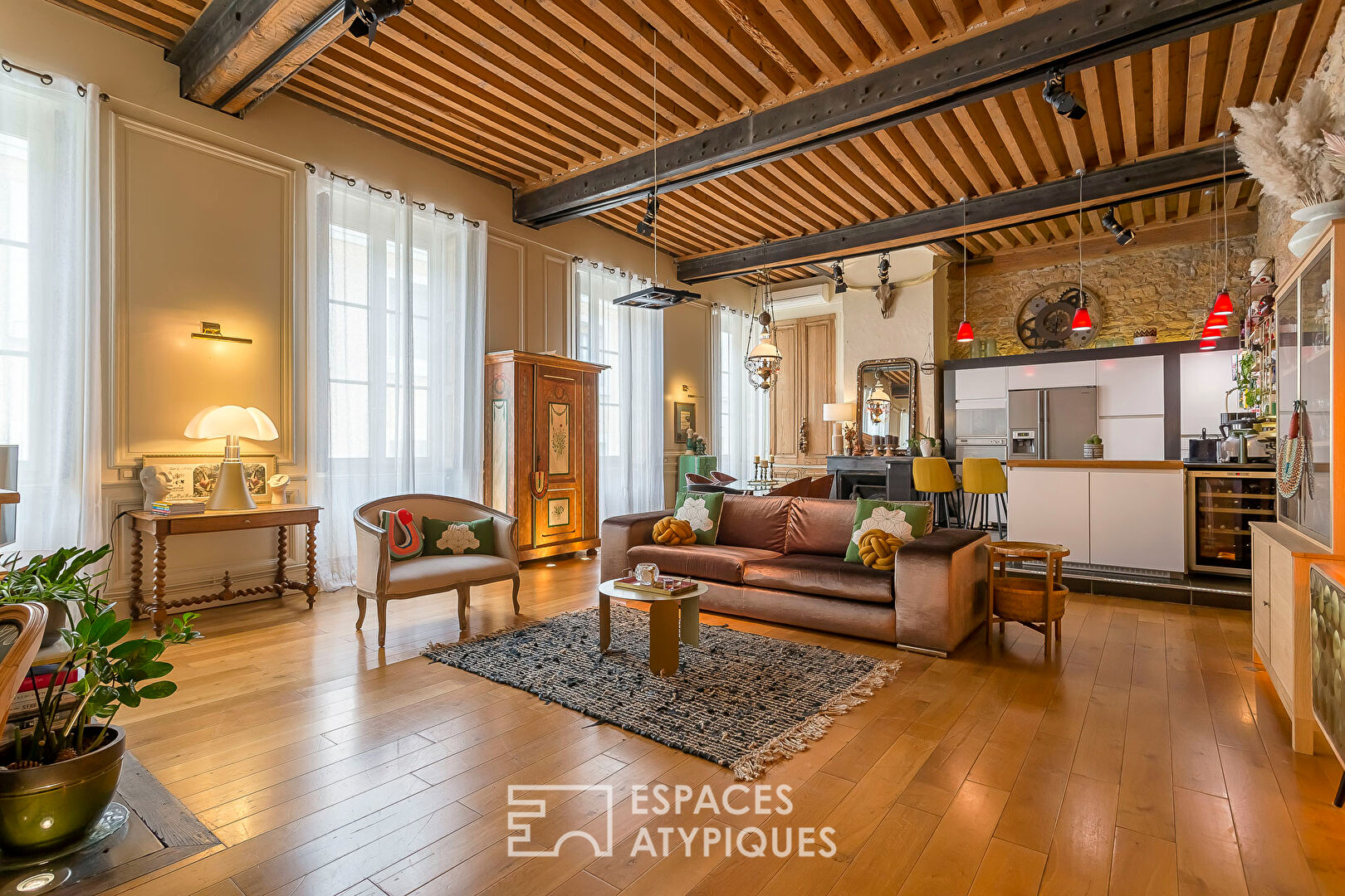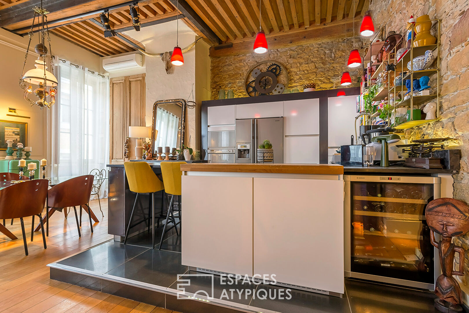 C’est alors, que la rénovation réussie de ce bien prend tout son sens : sol en chêne massif, pierres apparentes, IPN mettant en valeur un magnifique plafond à la française. Autant d’atouts davantage renforcés, ici et là, par d’astucieux éclairages indirects conférant à cet ancien atelier de canut une atmosphère intimiste et chaleureuse. Faisant face au salon, une cuisine Bernollin sur mesure et entièrement équipée prend place.