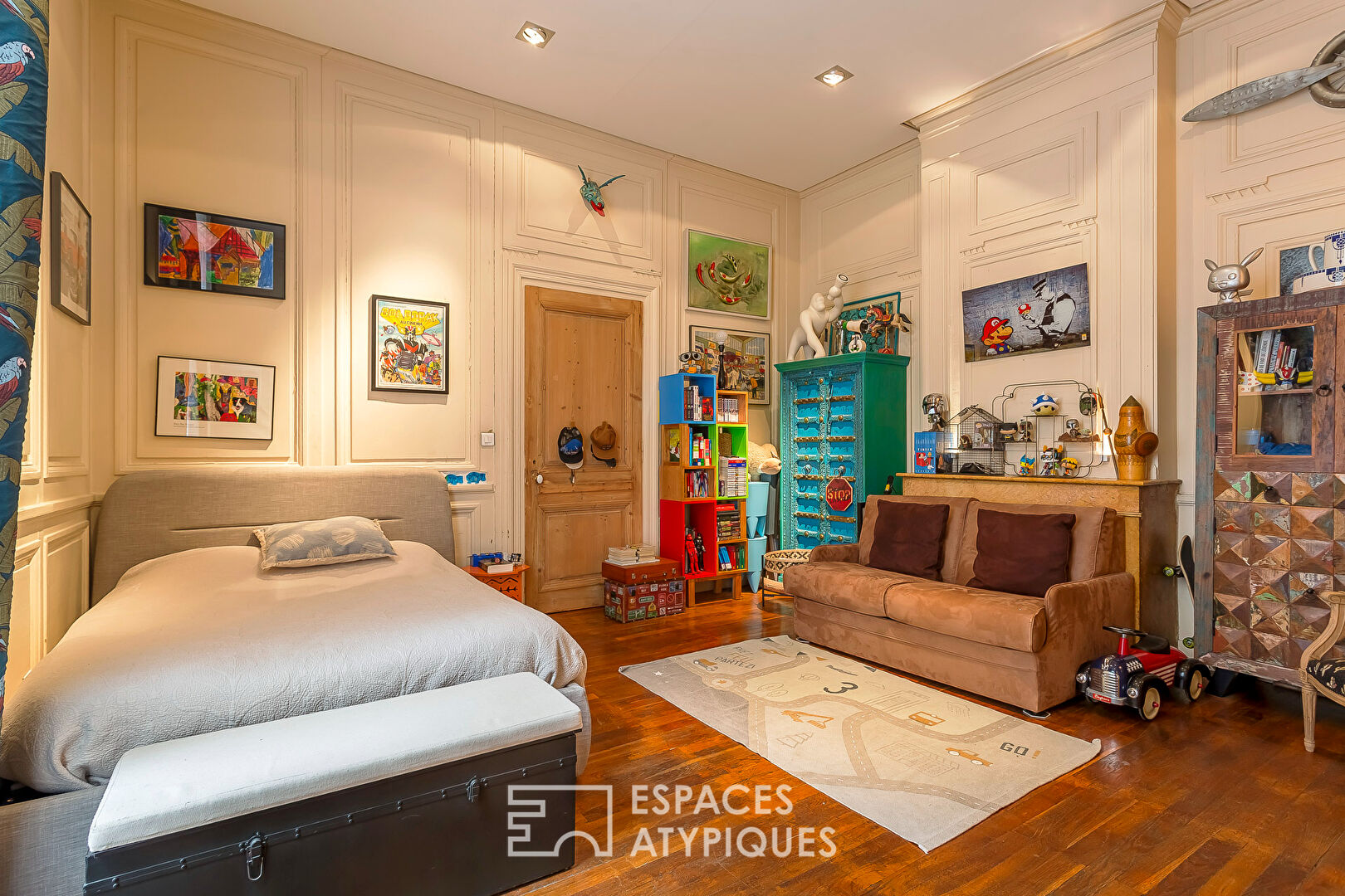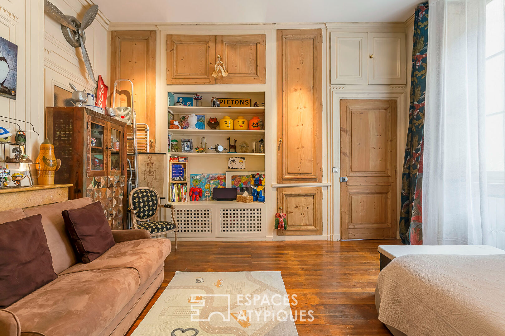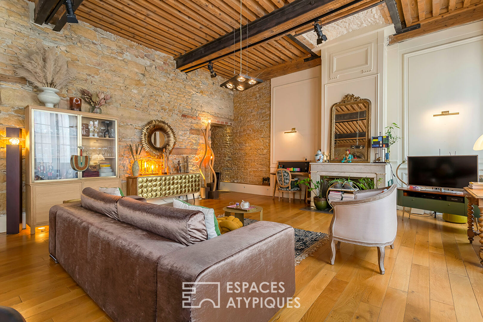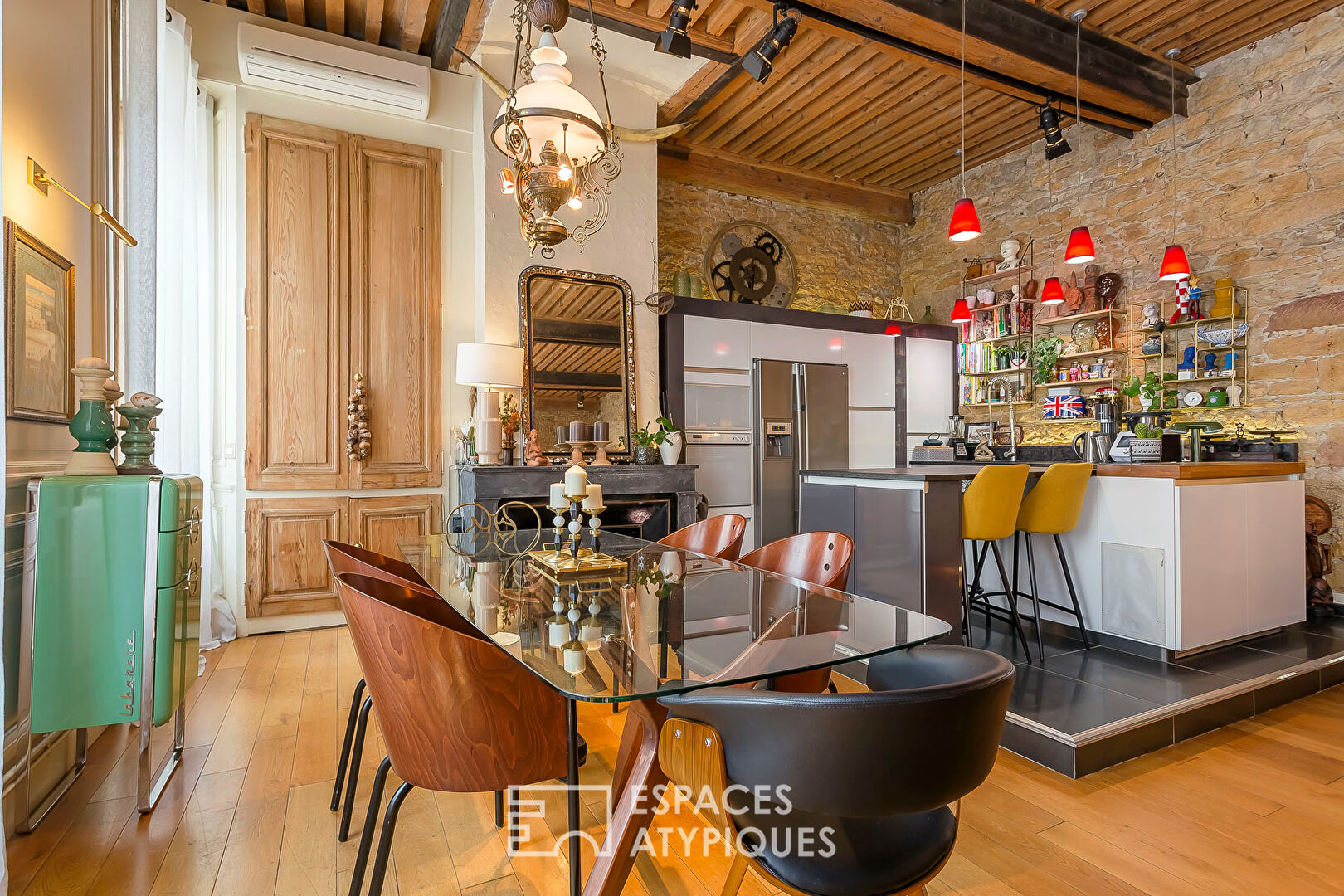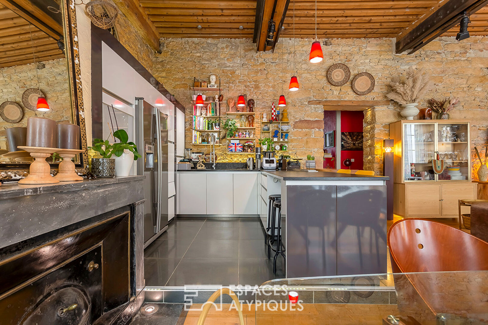C’est alors, que la rénovation réussie de ce bien prend tout son sens : sol en chêne massif, pierres apparentes, IPN mettant en valeur un magnifique plafond à la française. Autant d’atouts davantage renforcés, ici et là, par d’astucieux éclairages indirects conférant à cet ancien atelier de canut une atmosphère intimiste et chaleureuse. Faisant face au salon, une cuisine Bernollin sur mesure et entièrement équipée prend place.