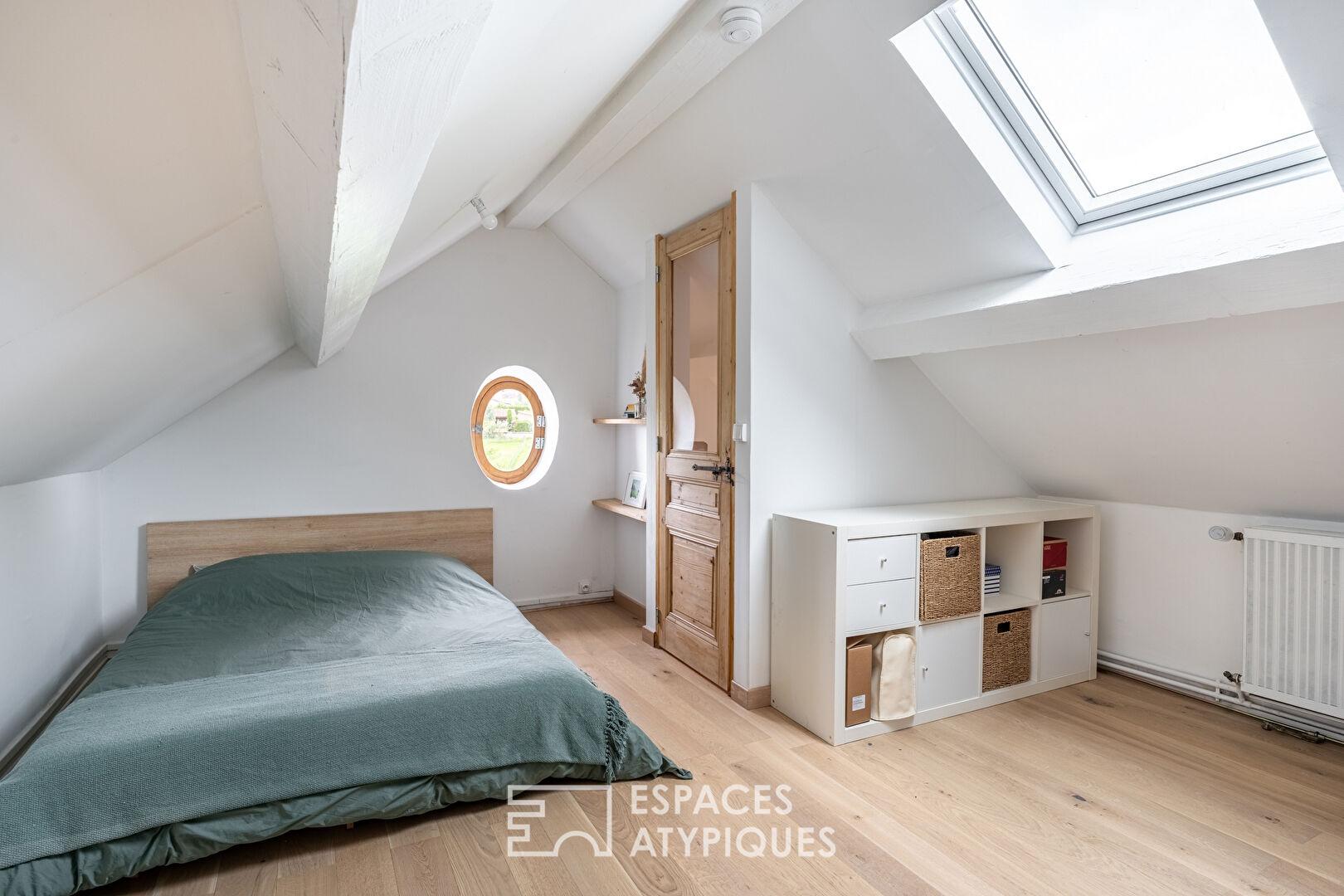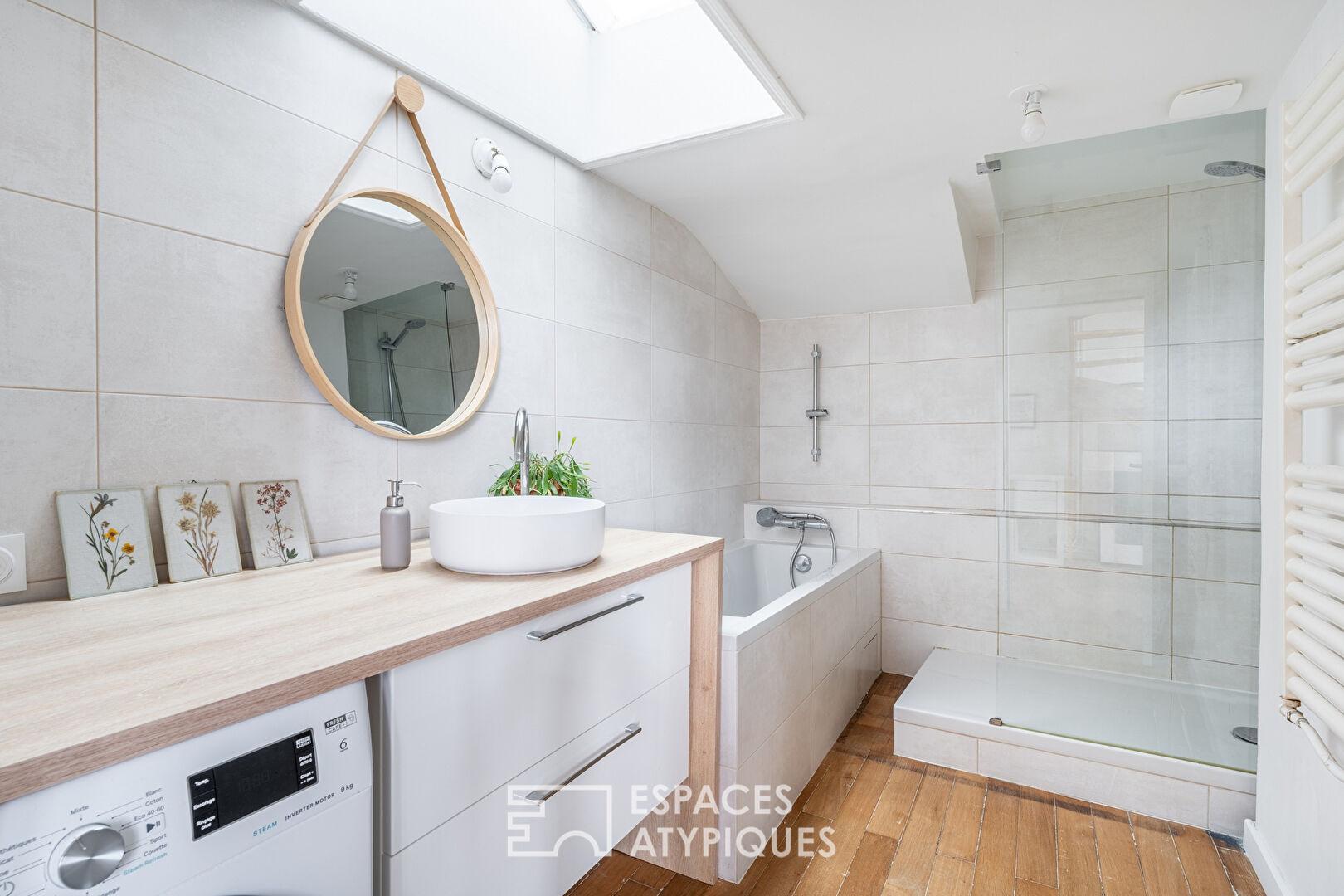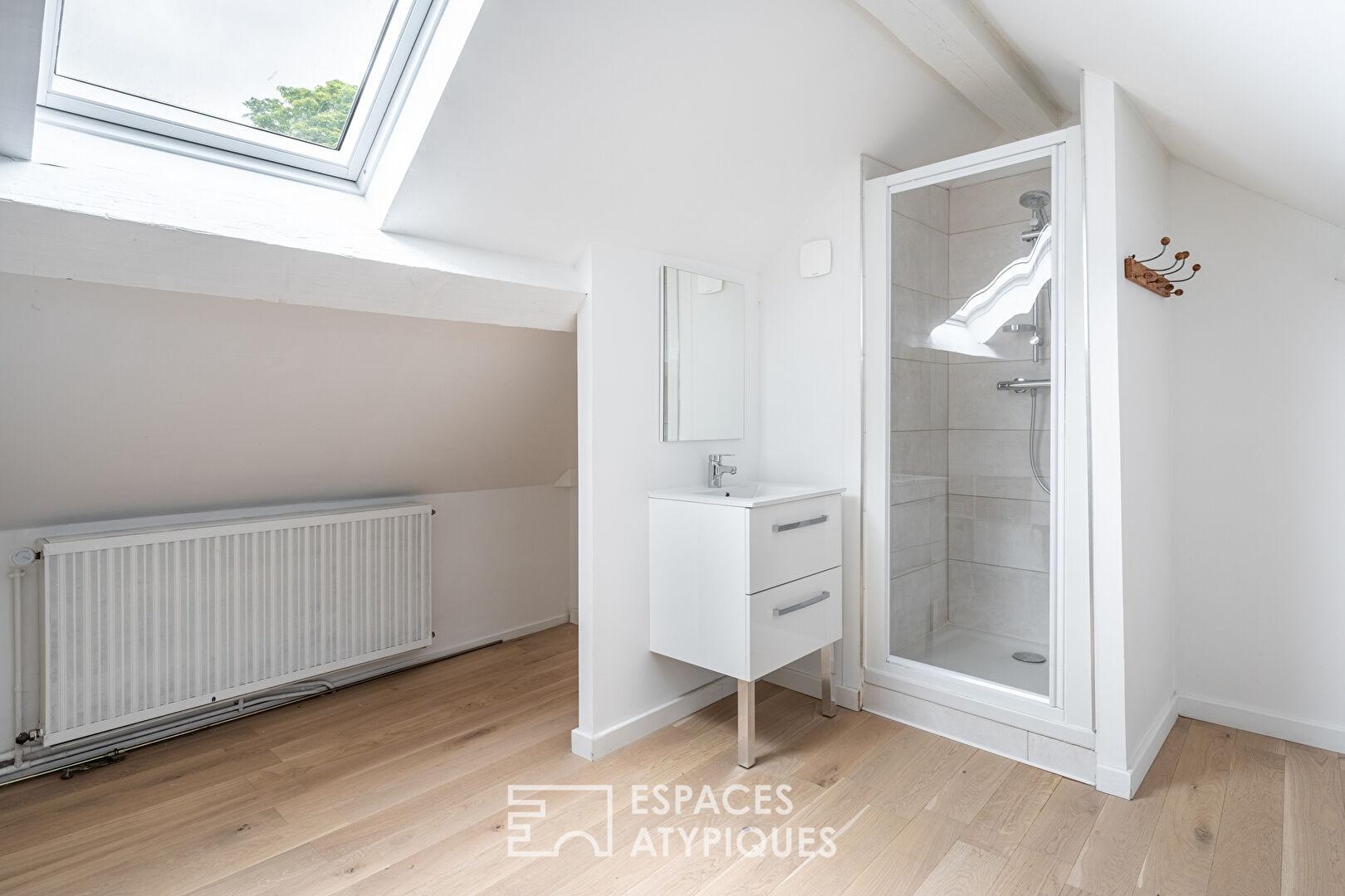 À droite du dégagement, une chambre, actuellement utilisée comme bureau, offre un accès direct à un balcon sans vis-à-vis avec vue sur la Saône, apportant une atmosphère chaleureuse et ensoleillée. Également à ce niveau, une salle de bains, élégante et rénovée avec soin, dispose d’une douche et d’une baignoire. Un autre escalier mène à une suite parentale avec salle d’eau privative, idéale pour accueillir des invités.