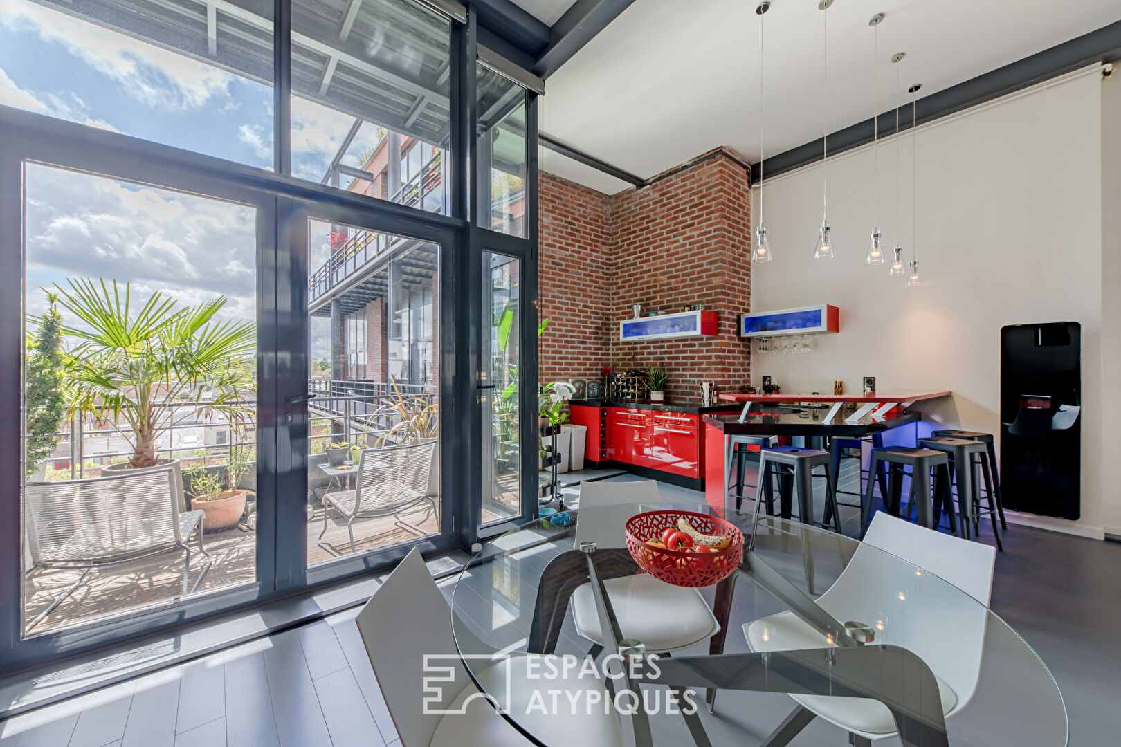 Tous les codes du loft sont présents, des murs en briques, aux poutres métalliques en passant par les mezzanines surplombant le séjour.
