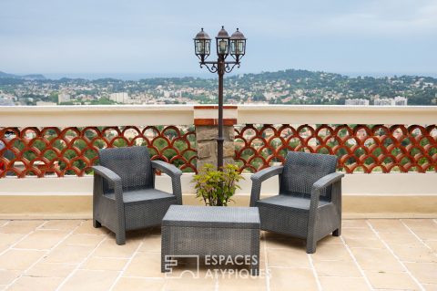 Quelques marches nous amènent ensuite directement sur la terrasse de 81 m2 doté d’une douche extérieure d’une buanderie et d’un jacuzzi ainsi qu’une vue dominante sur la rade de Toulon.