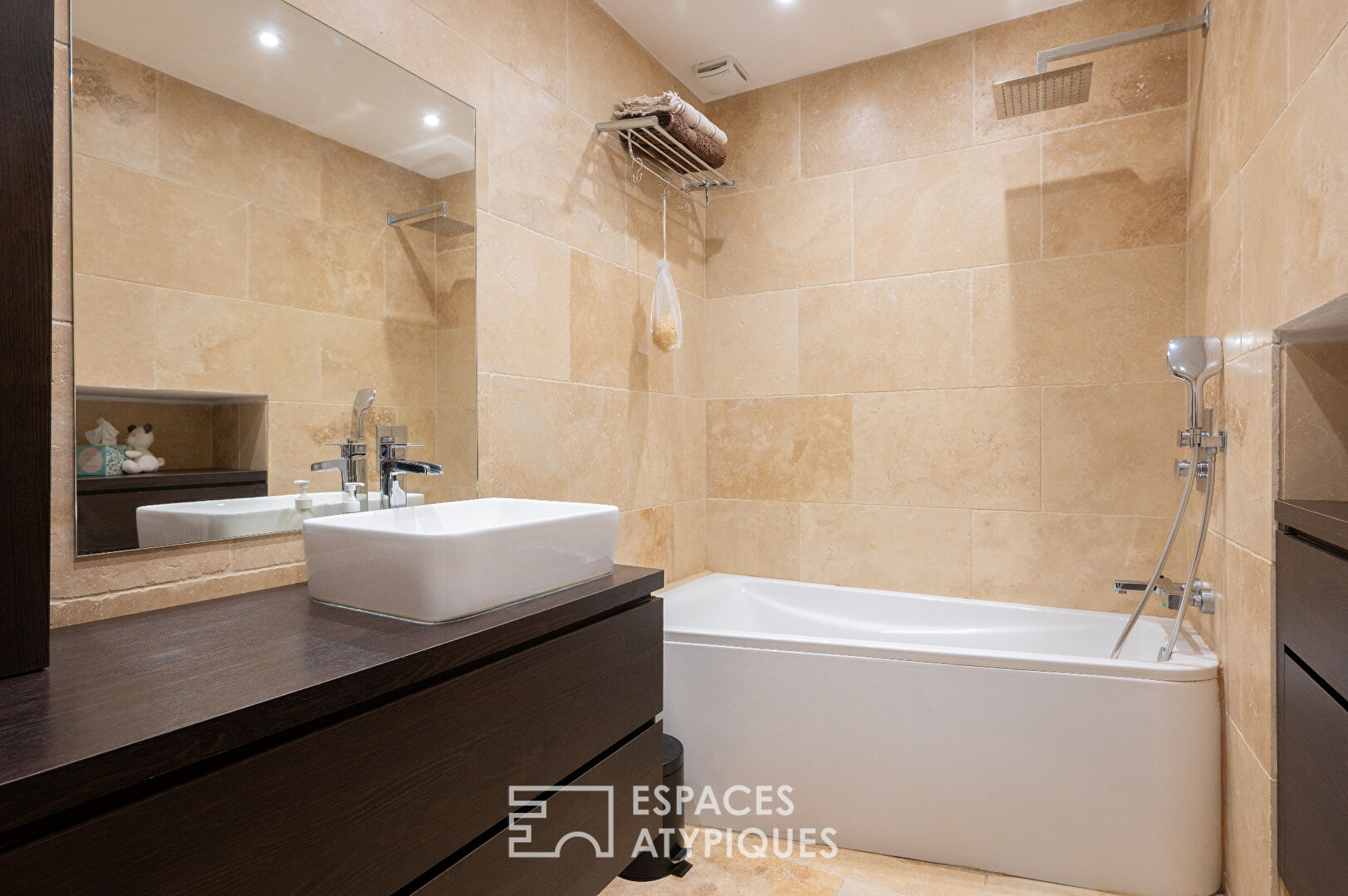 Au même niveau se niche l’appartement tout confort de 86 m2, climatisé, qui comprend deux chambres, un séjour, une cuisine équipé, une salle de bains, un WC, et des placards de rangement. L’ensemble est rénové. Deux caves complètent ce bien.
