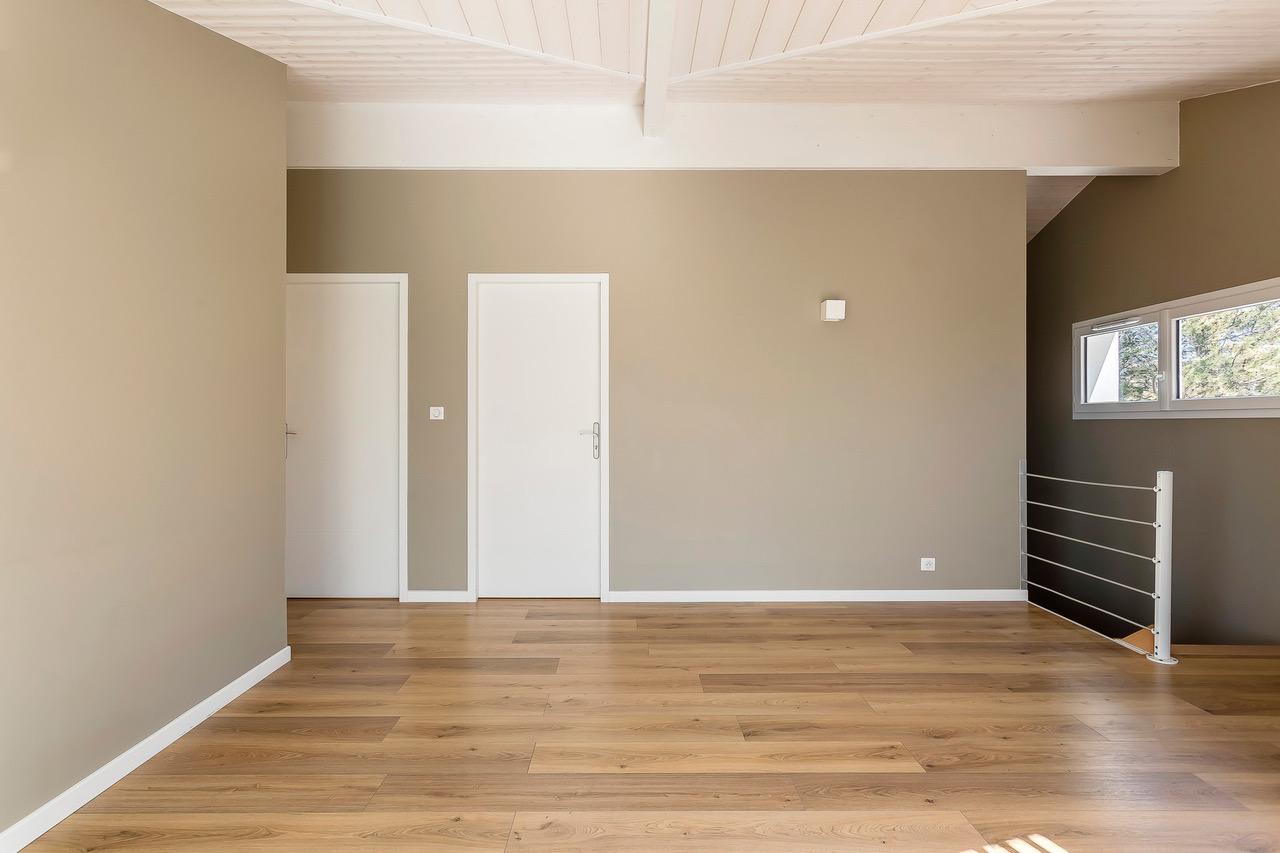 L’escalier en bois nous mène à l’étage qui se compose d’un beau dégagement idéal pour un espace bureau lumineux avec un cadre agréable donnant sur la verdure.