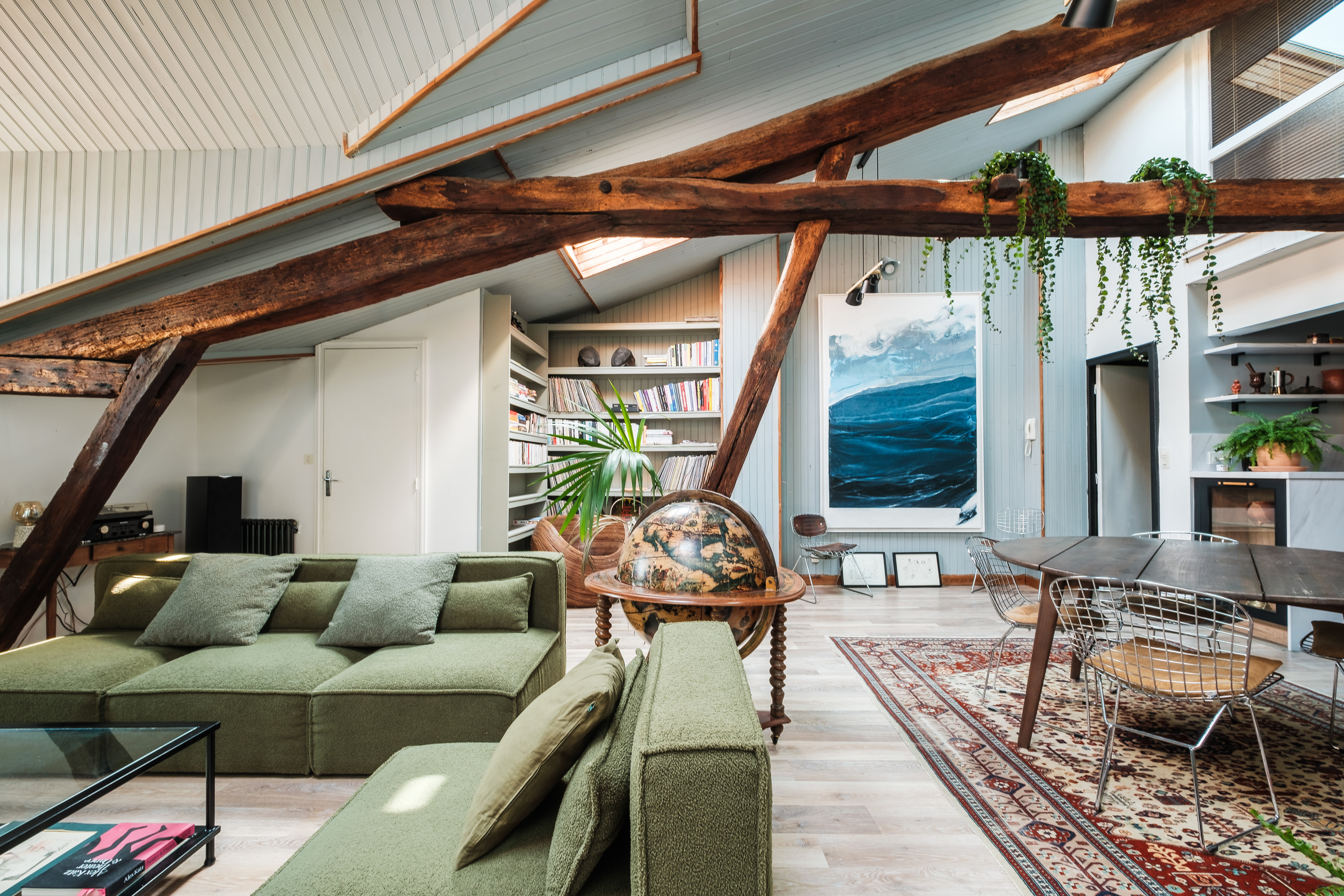 Sous les toits, l’enjeu n’est pas de “corriger” les pentes : il s’agit d’en faire des repères. Les zones basses deviennent des alliées (rangements, coin lecture, alcôve), pendant que les parties dégagées libèrent la circulation et la lumière. Dans certains duplex, des poutres peuvent même structurer naturellement salon, salle à manger et cuisine sans cloisonner, tout en gardant une vraie fluidité.