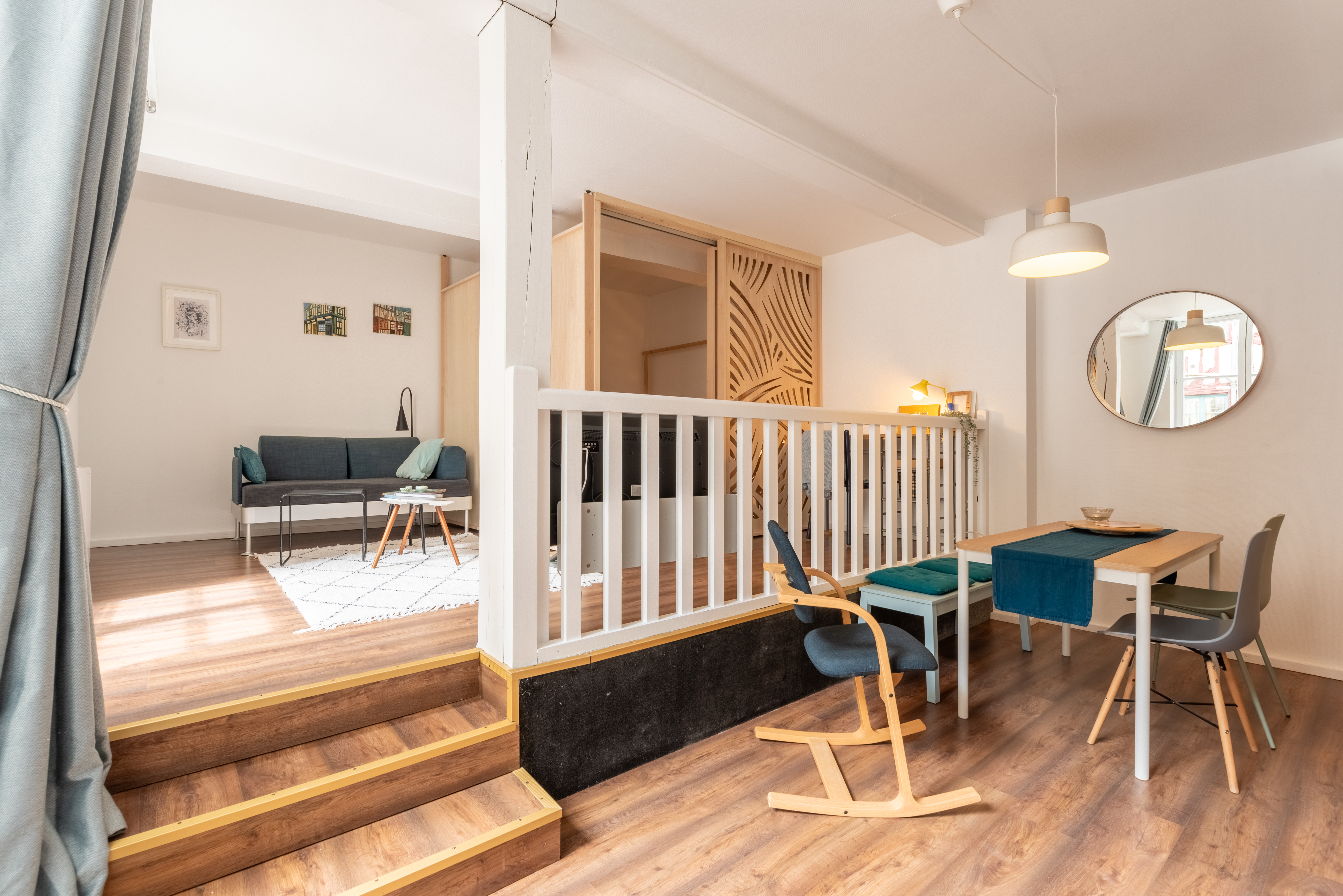 Julien : « Dans les petits espaces, l’agencement repose avant tout sur la qualité des circulations et la lisibilité des usages. (…) Les teintes claires, les bois lumineux et les jeux de miroirs amplifient la perception des volumes, tandis que des solutions modulables, comme un rideau ou une mezzanine, offrent la possibilité de cloisonner sans figer l’espace. »