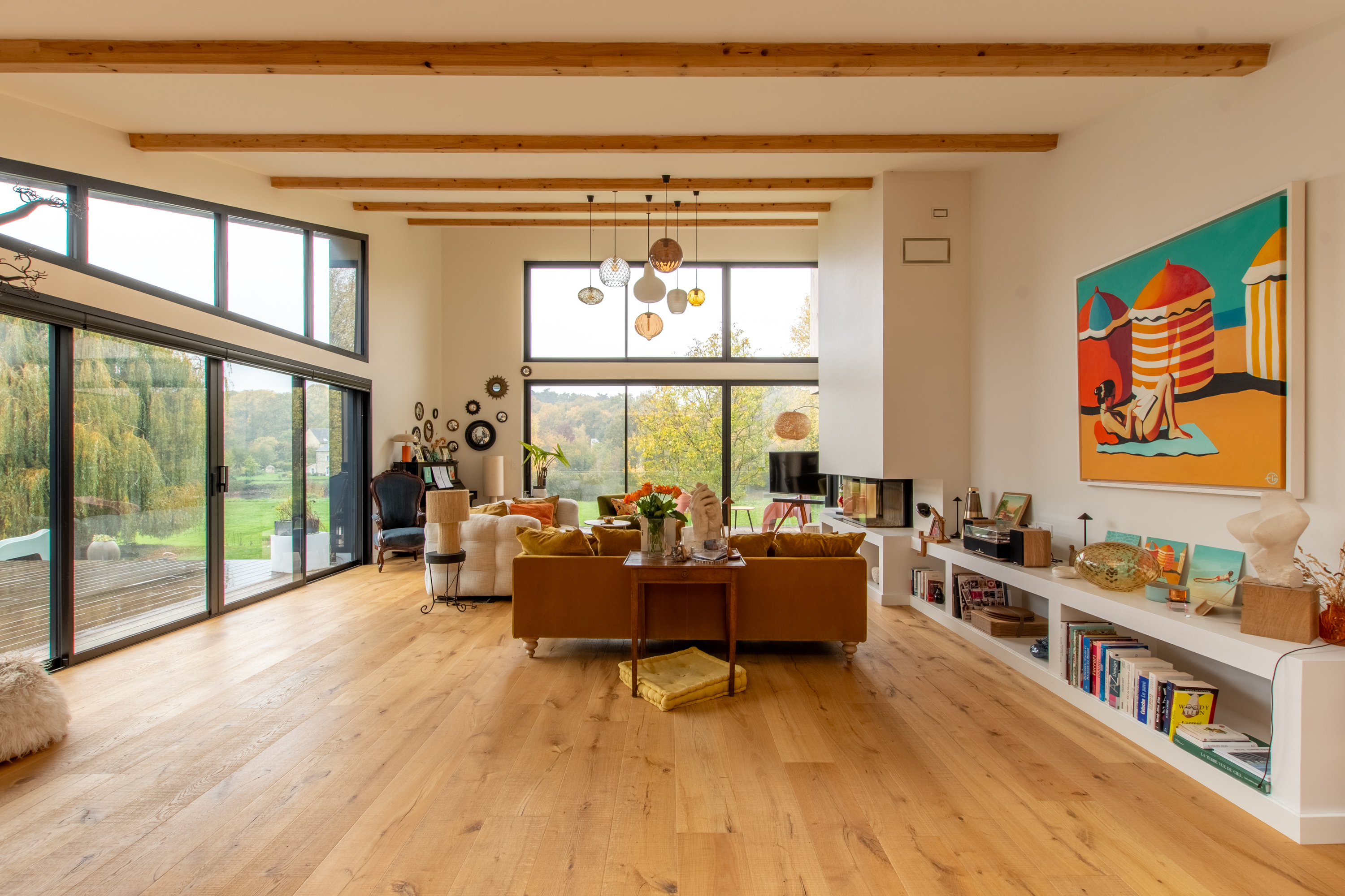 Dans les grands volumes, tout se joue dans le rythme : penser en “séquences de vie” plutôt qu’en pièces fermées. Transparences, retraits, perspectives… mais aussi textures et nuances qui dessinent des zones sans casser l’ensemble. Des éléments intégrés viennent ponctuer, aérer, guider la lecture — avec une organisation qui reste ouverte, mais jamais floue.