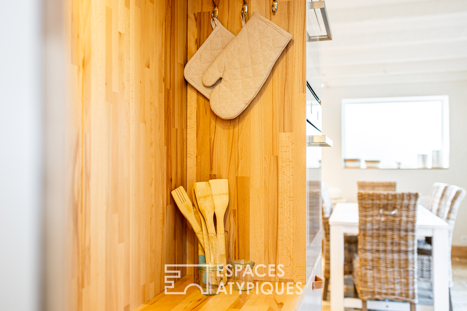 L’entrée dévoile une pièce de vie de 35 m2 environ à la décoration raffinée et feutrée, baignée de lumière où les éléments d’origine dont les murs en pierres apparentes sont valorisés par la sélection des matériaux et le sol. La cuisine aménagée et équipée est fonctionnelle. Le rez-de-chaussée est complété par la salle d’eau et une toilette indépendante.