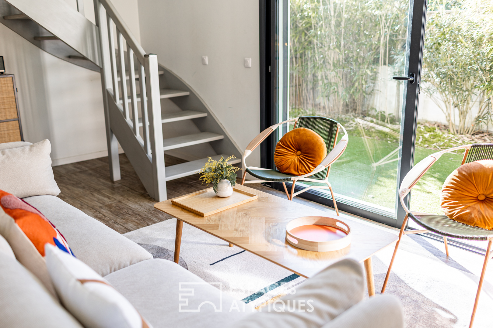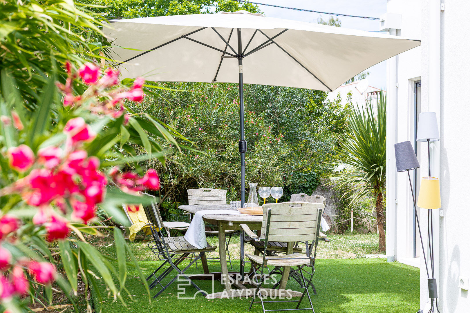 À l’extérieur, la terrasse accessible par le salon et la salle à manger permet de se retrouver au retour de la plage, pendant que les enfants jouent à l’extérieur en toute sécurité grâce son jardin entièrement clos.