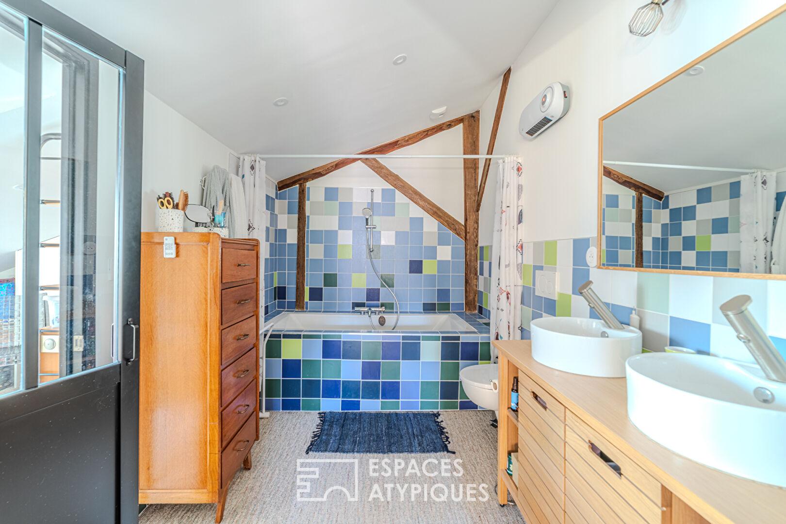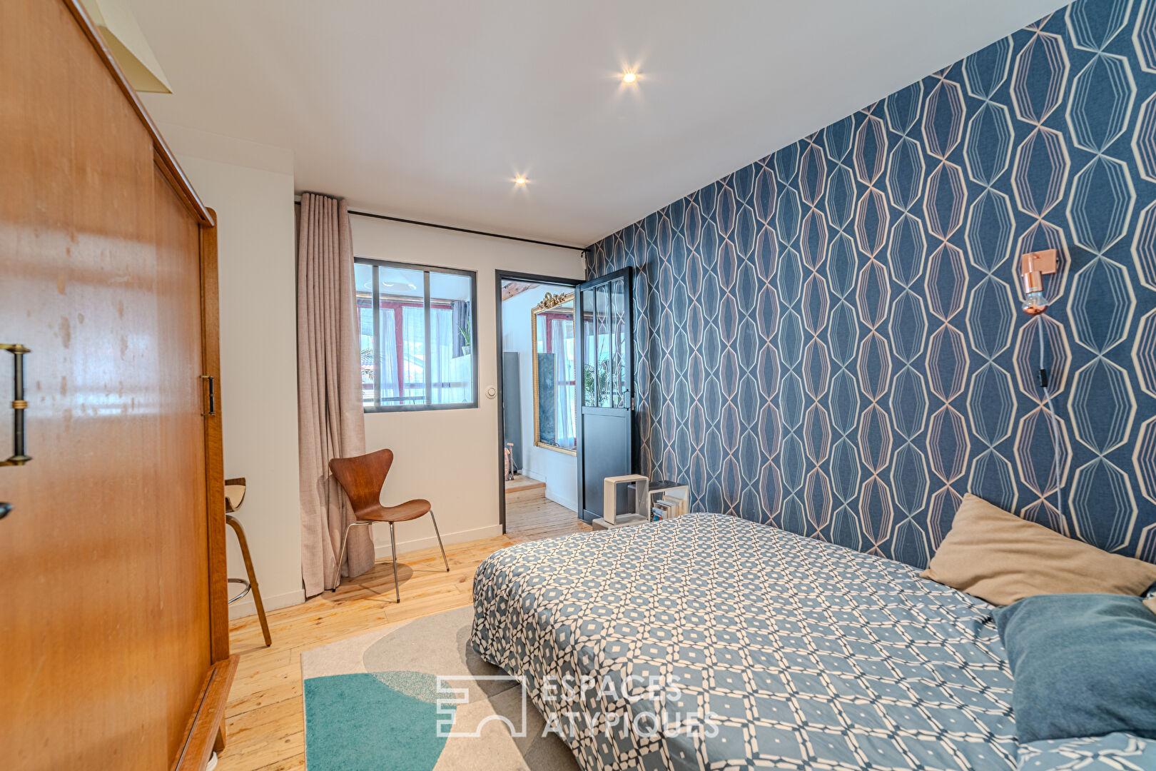 Dès l’entrée, accessible par une charmante courette et une large baie vitrée, les volumes annoncent un lieu de vie hors normes à l’ambiance bohème chic. Le rez-de-chaussée accueille une entrée avec sas, une pièce multifonction pouvant s’adapter aux besoins, ainsi qu’une salle de douche. Le premier étage dévoile un espace de vie lumineux composé d’une cuisine ouverte sur le séjour, prolongée par un salon tourné vers un patio à l’abri des regards, véritable cœur de la maison. Une chambre avec salle d’eau complète ce niveau.