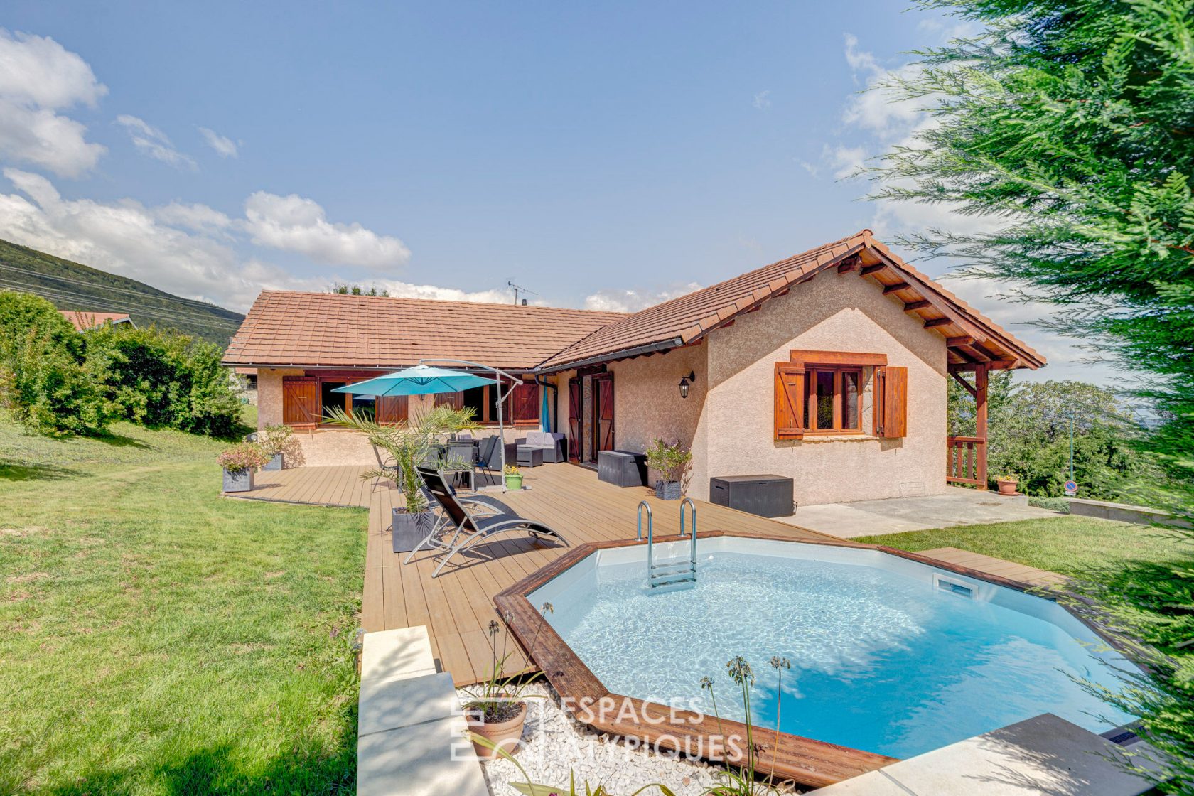 Dès l’entrée, une perspective où se mêle intérieur et extérieur conduit à une cuisine aménagée et équipée. Dans la continuité, la pièce de vie bénéficie d’ une belle hauteur sous plafond. Le salon au toit-cathédrale possède un volume généreux et confortable. Des ouvertures vers l’extérieur permet un accès direct à la terrasse et au jardin avec sa piscine chauffée.