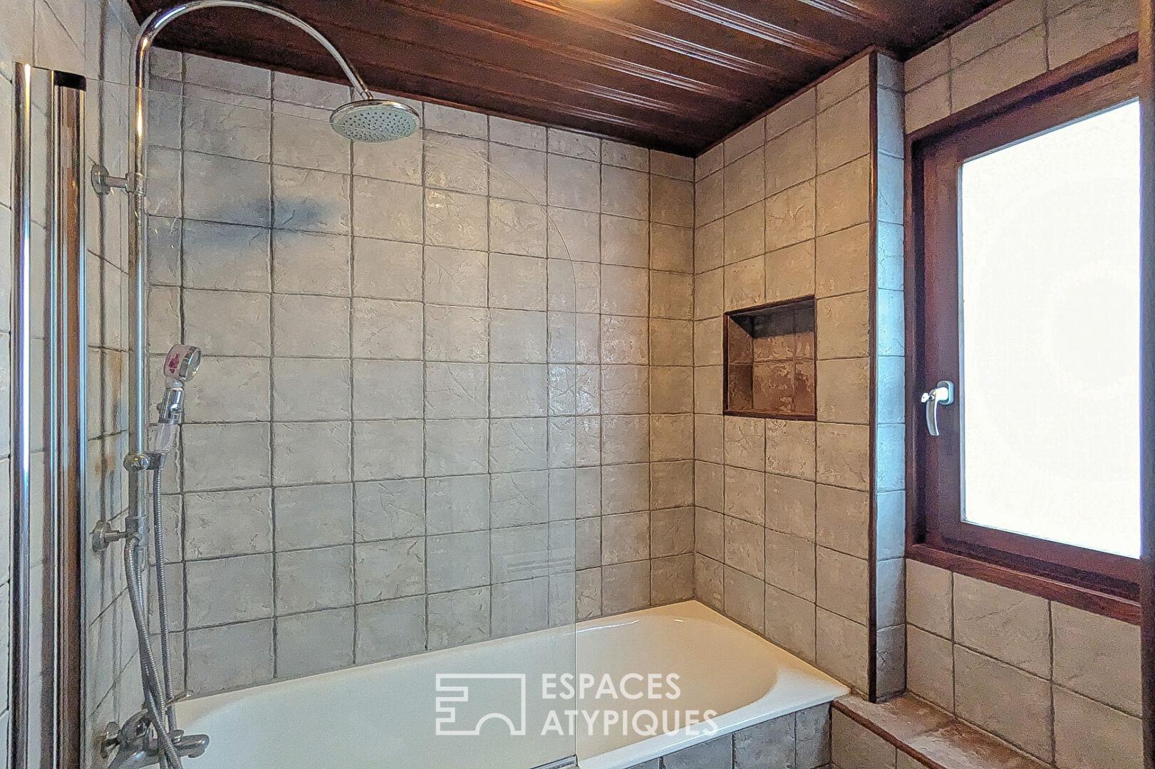 Le jardin en terrasse est un véritable havre de paix. La terrasse extérieure domine un petit cours d’eau en contrebas, créant une atmosphère sereine et naturelle. La maison est également équipée de stores électriques sur la partie basse, offrant un confort optimal au quotidien.