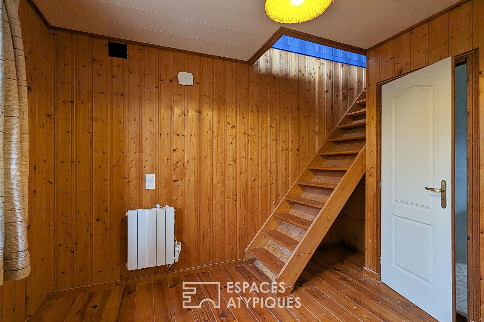 À l’étage, un escalier en bois mène à un espace nuit composé de trois chambres. La chambre principale, spacieuse et confortable, bénéficie d’un accès direct sur un balcon périphérique et d’un espace supplémentaire accessible par un petit escalier en bois, idéal comme coin détente ou pour un couchage d’appoint. Les deux autres chambres, plus compactes, sont idéales pour les enfants ou les invités. Une salle d’eau bien aménagée, avec baignoire et rangements intégrés, complète cet étage.