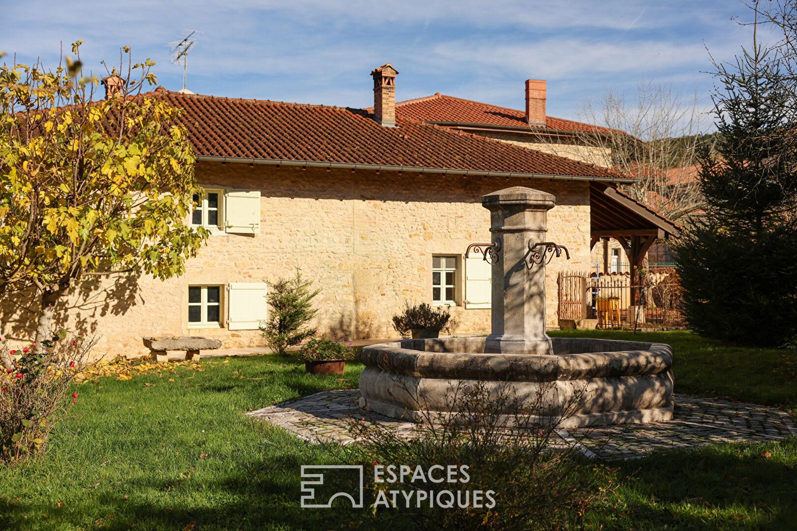 Située au centre du charmant village de Meillonnas, sur les contreforts du Revermont, cette élégante maison en pierre d’environ 246 m² séduit par son cachet intemporel et son atmosphère familiale.