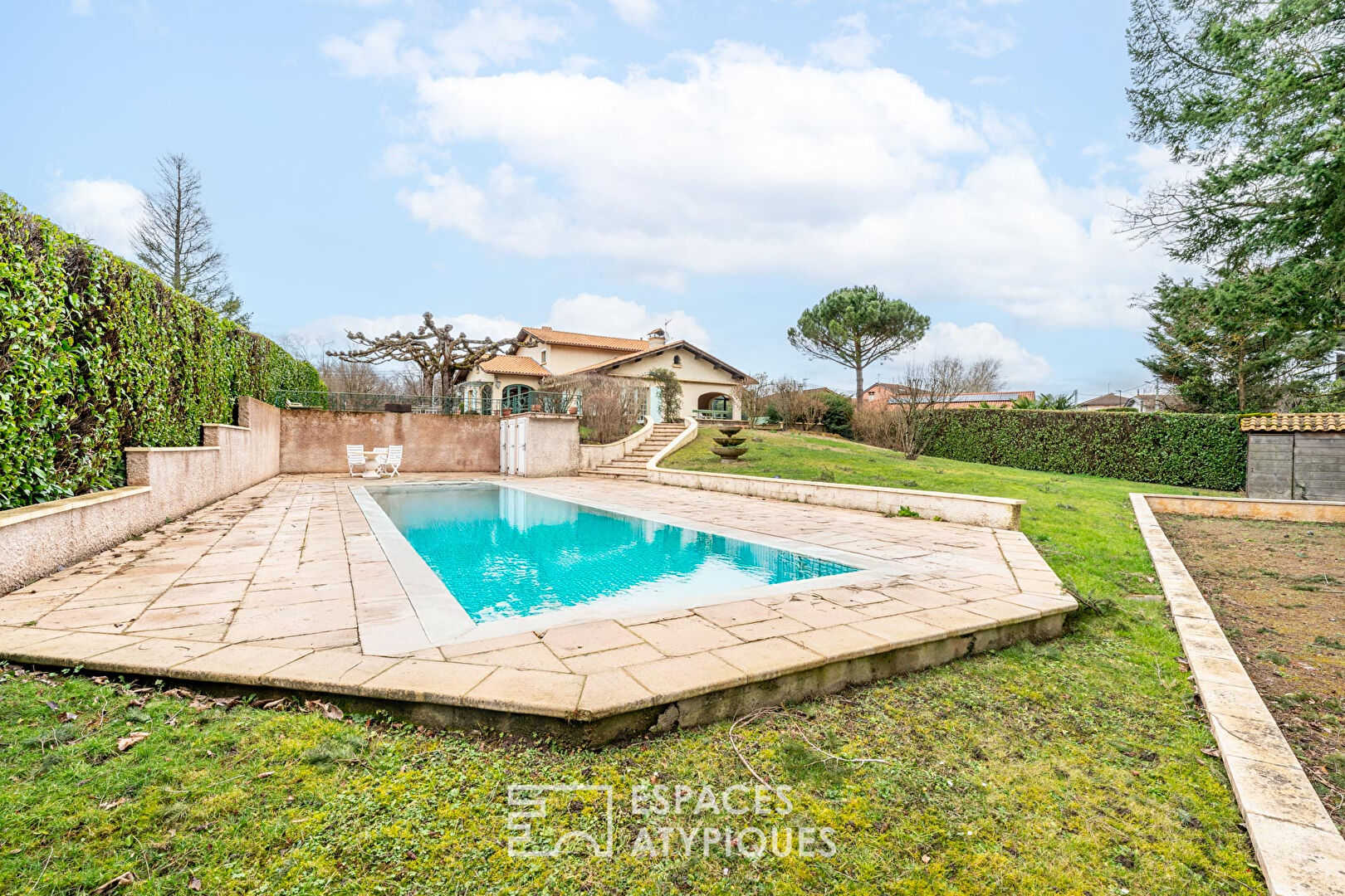 Le jardin paysager, véritable havre de paix, dispose d’une piscine privée, parfaite pour les journées ensoleillées. Des espaces ombragés sous les arbres et des allées gravillonnées confèrent à l’ensemble une atmosphère sereine et accueillante.