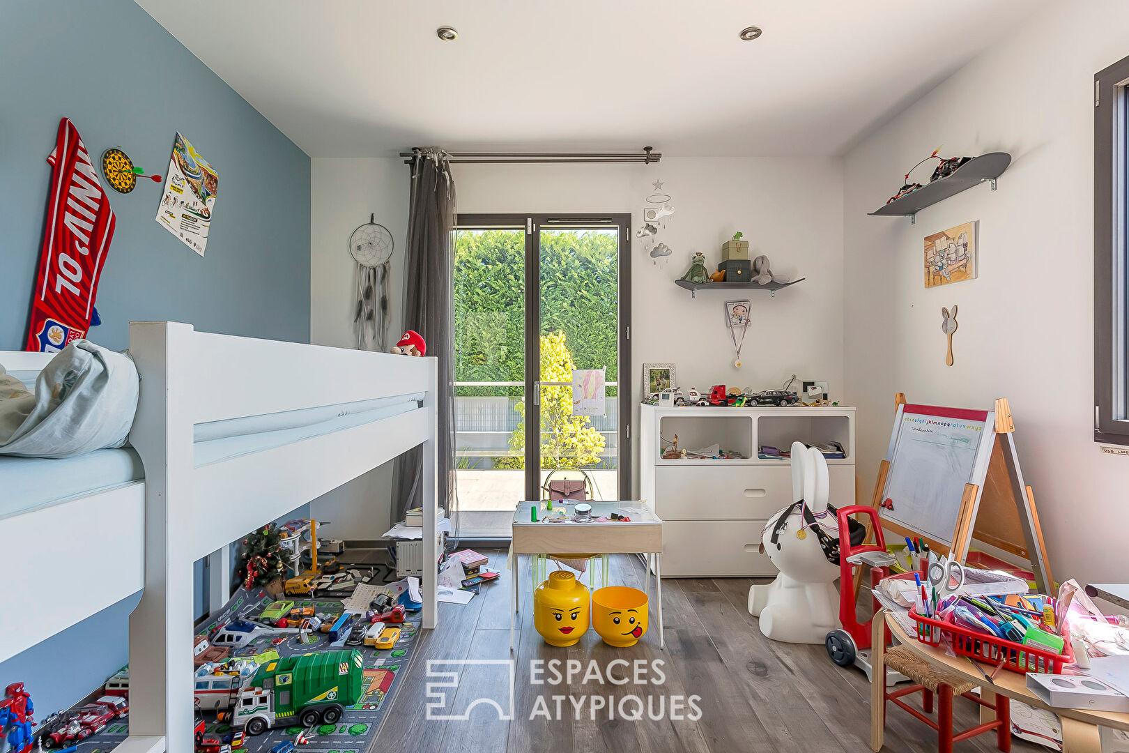 À l’abri des regards, au coeur d’un environnement privilégié, et à 15 minutes de Lyon sur la commune prisée de Neyron, cette maison contemporaine de 2018 déploie ses lignes épurées et ses volumes spectaculaires sur une surface habitable de 291m², pensée comme une véritable oeuvre architecturale.