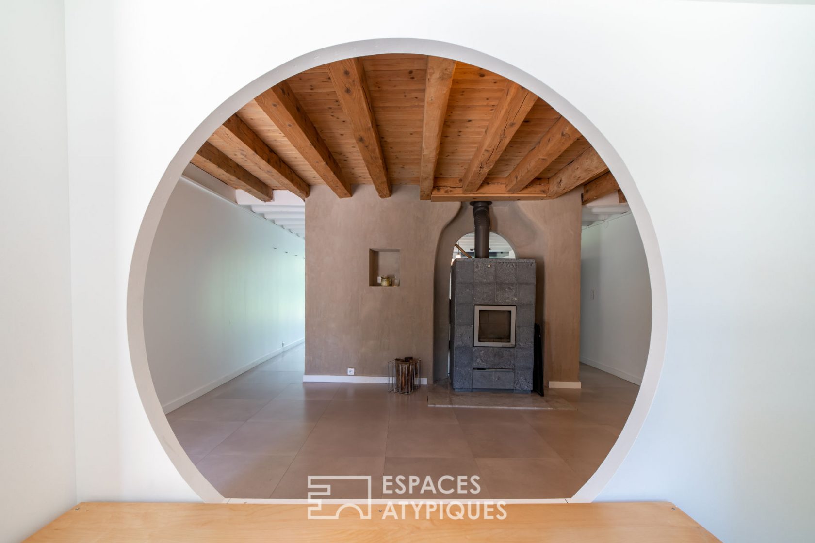 Vient dans un premier temps un salon cosy, où trône un superbe poêle de masse lui apportant une atmosphère chaleureuse et confortable. Dans sa continuité, une cuisine aménagée s’ouvre sur une salle à manger lumineuse avec accès direct sur la terrasse.