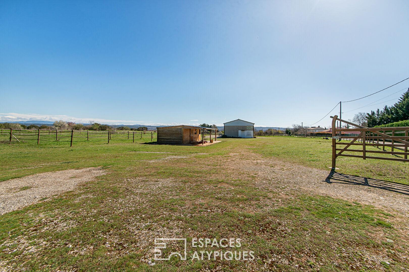 L’ensemble se compose d’une partie privée, entièrement clôturée d’environ 3 500 m² avec portail motorisé et système d’arrosage, accueillant la maison et ses espaces de détente, ainsi qu’un espace équestre attenant de 10 000 m², doté d’installations professionnelles complètes.