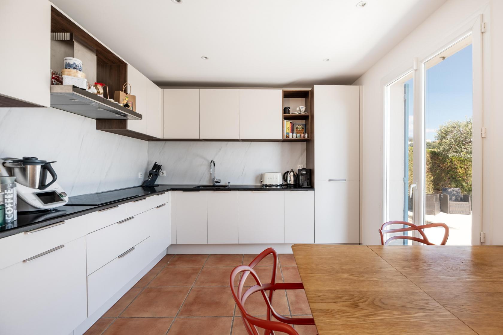 L’agencement intérieur a été pensé pour le confort et l’intimité de chacun. À l’étage, l’espace nuit accueille trois chambres paisibles, avec vue mer ou collines, ainsi que deux salles d’eau avec deux toilettes. Le rez-de-chaussée dispose quant à lui d’une salle d’eau supplémentaire avec un toilette, facilitant la vie quotidienne. Pour compléter l’ensemble, le sous-sol offre un potentiel remarquable : actuellement aménagé en buanderie et bureau ou chambre d’appoint, il peut aisément être réinventé en salle de sport, home-cinéma ou atelier de création selon vos projets.