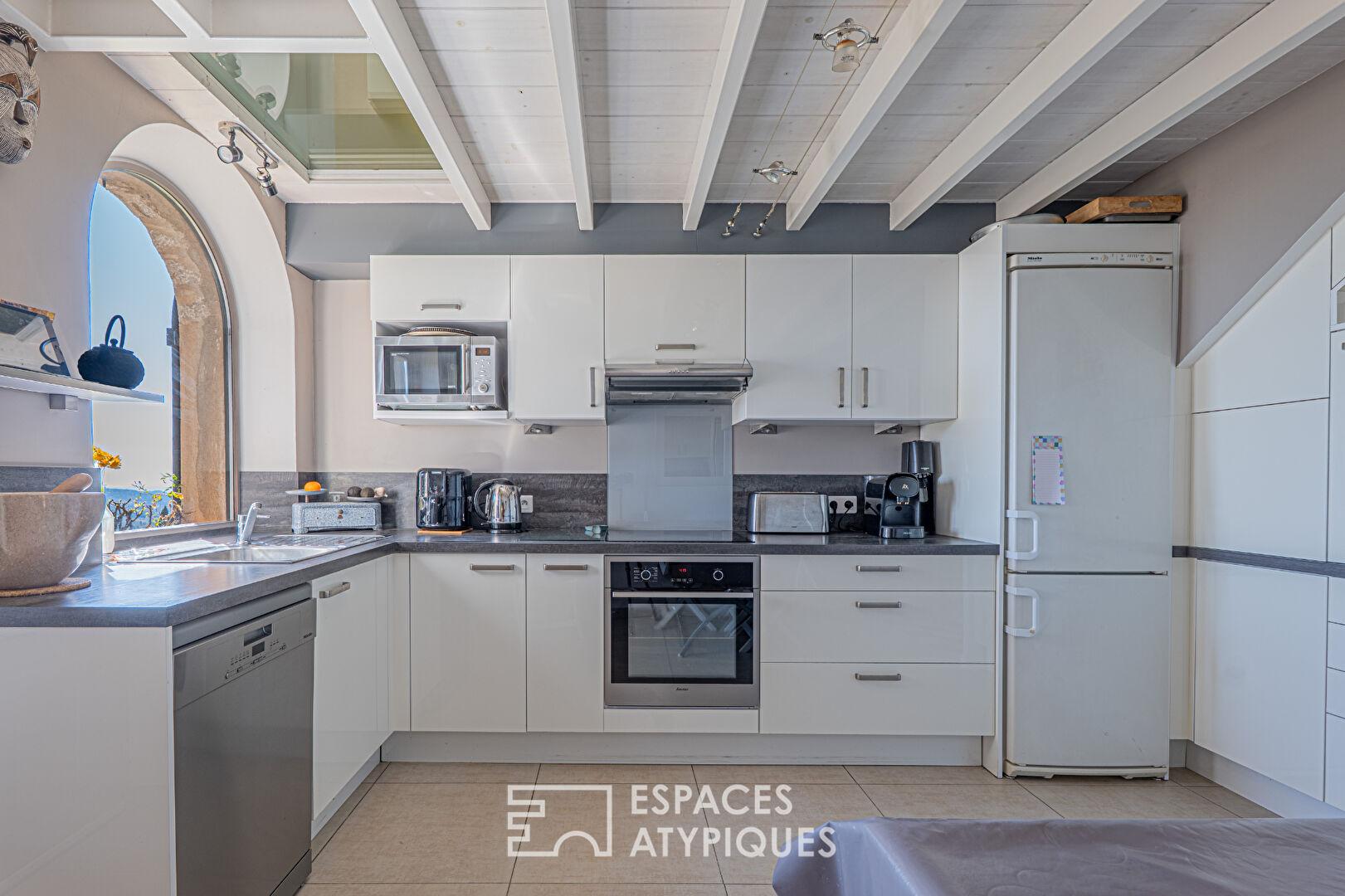 Le jardin, entièrement piscinable, offre un potentiel d’aménagement exceptionnel face à l’horizon. En écho à l’habitation principale, une maisonnette indépendante propose un studio de 27 m² à l’étage surplombant deux garages, idéal pour un projet locatif ou un havre créatif. Ce refuge atypique est une opportunité rare pour les amoureux de l’horizon marin.