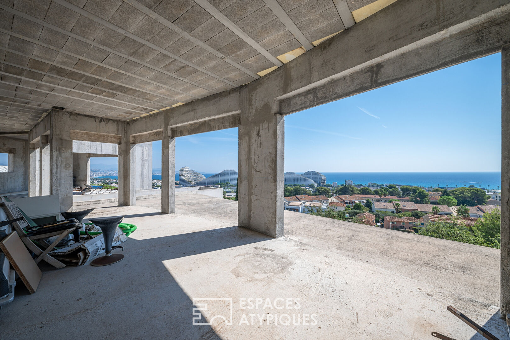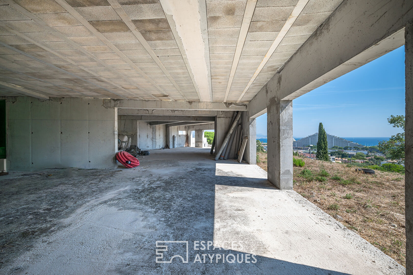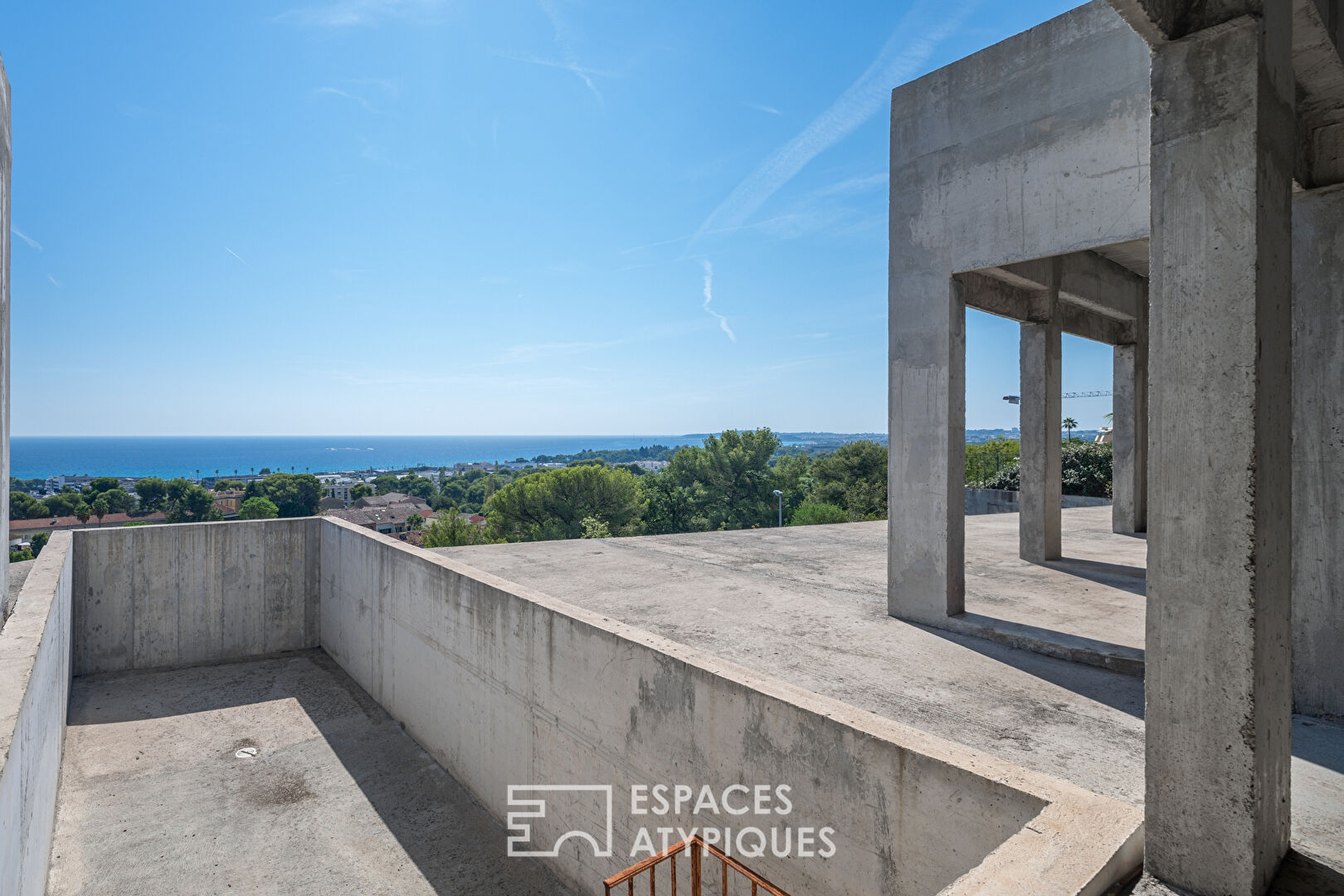 Cette villa Californienne de 270m² prête à finir, est située sur les hauteurs de Villeneuve-Loubet, près des Hauts de Vaugrenier, et se développe sur une parcelle de plus de 1.600m2.