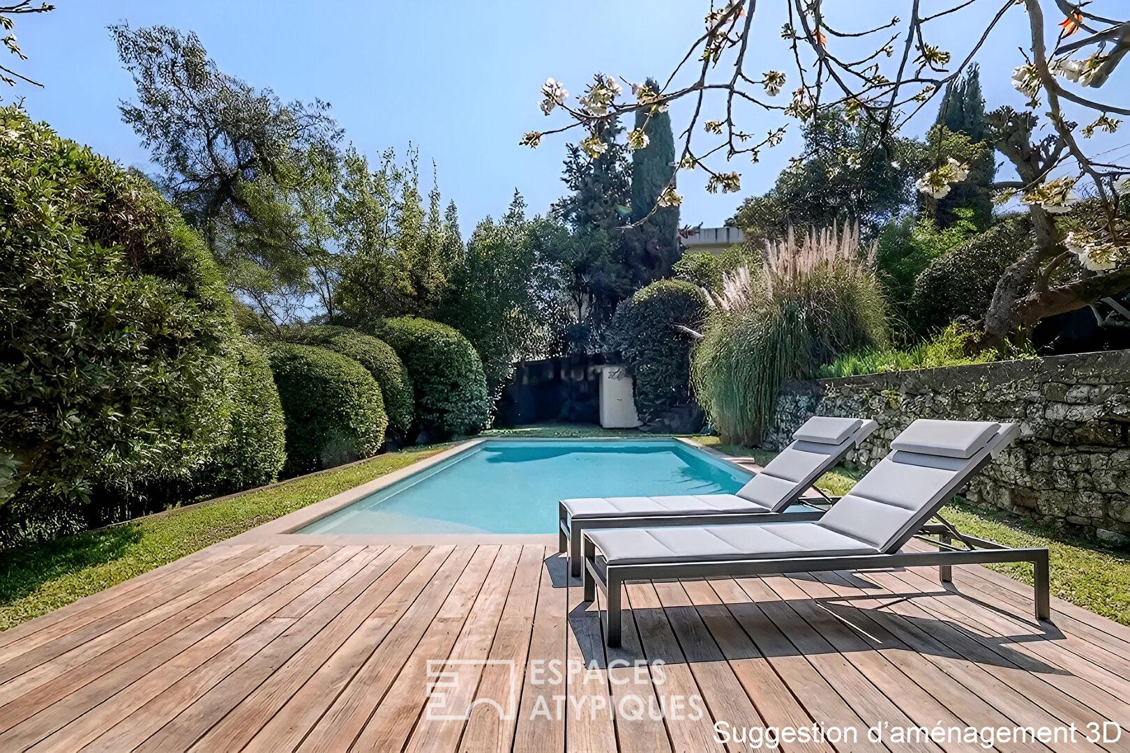 L’extérieur est une ode à la Riviera sauvage. Le jardin, sculpté en terrasses méditerranéennes, abrite une piscine généreuse de 11 mètres de long dont le bleu profond contraste avec le vert persistant des essences locales. Une cuisine d’été avec barbecue promet des moments suspendus sous le ciel azuréen.