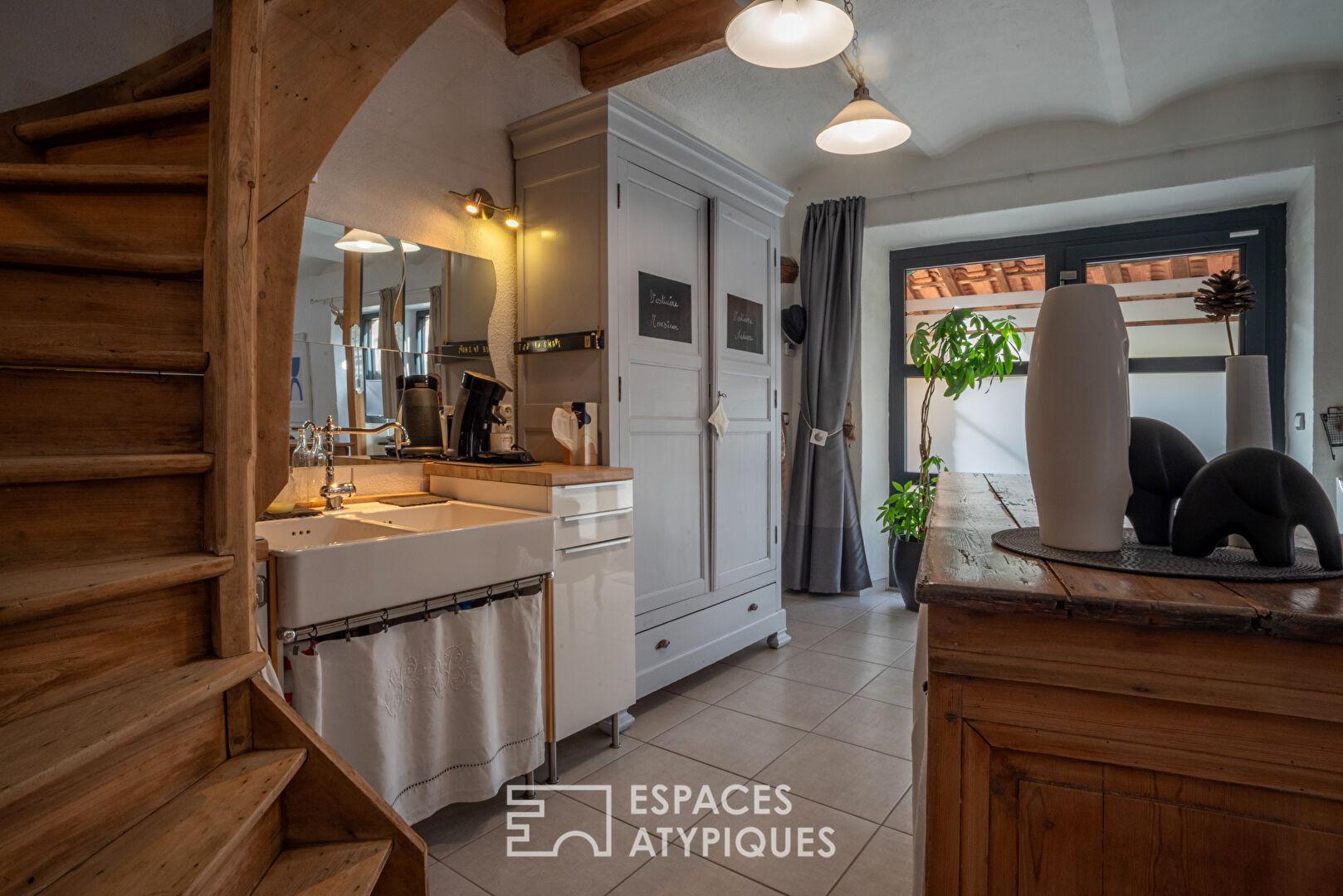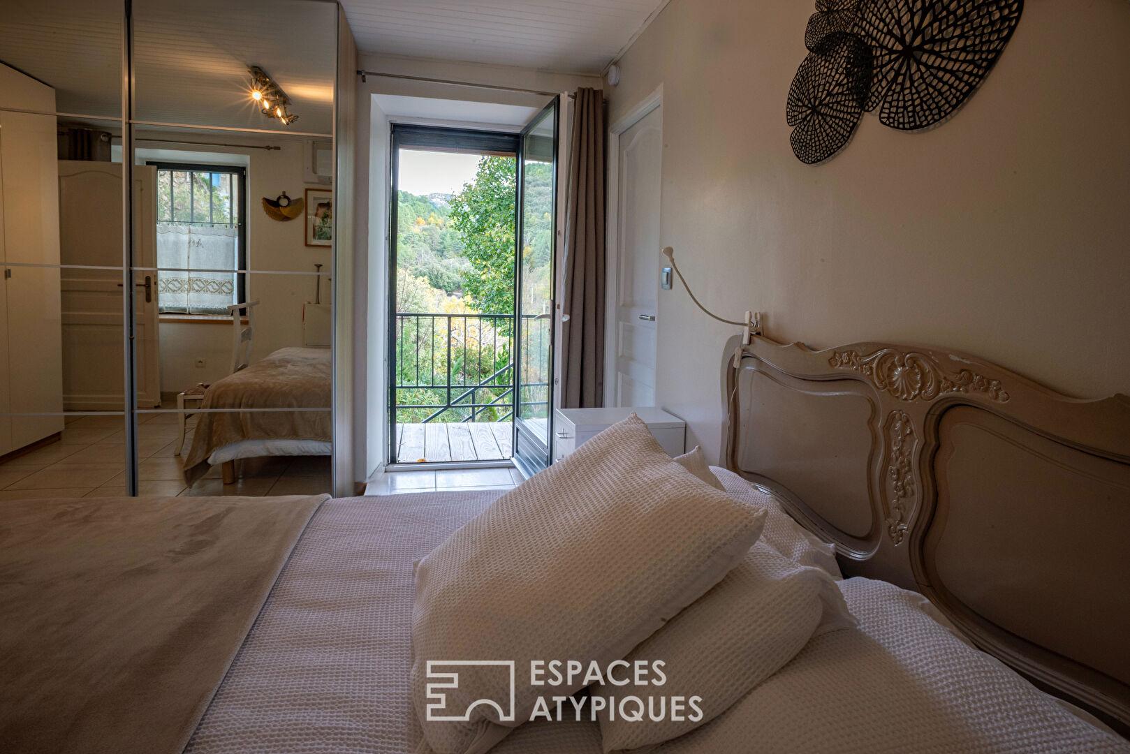 A l’intérieur, cette bâtisse en pierres organisée sur trois niveaux a été rénovée avec soin conservant ses volumes authentiques et son charme tout en intégrant de nouveaux équipements. Le rez-de-jardin accueille une cuisine avec évier en pierre de Montpellier ouverte sur un petit salon d’été voûté ainsi qu’une salle d’eau avec wc, un cellier et un atelier de bricolage attenant. Un bel escalier en frêne oeuvre d’un artisan local mène au premier étage où un grand séjour lumineux climatisé équipé d’un comptoir avec évier profite d’une superbe vue dégagée sur la montagne du Cham du Cros et son sommet à 1208m d’altitude. Un poêle à bois de marque Bruno diffuse pour sa part une atmosphère chaleureuse. Une chambre confortable avec terrasse privative et salle d’eau attenante ainsi qu’un wc complètent ce niveau.