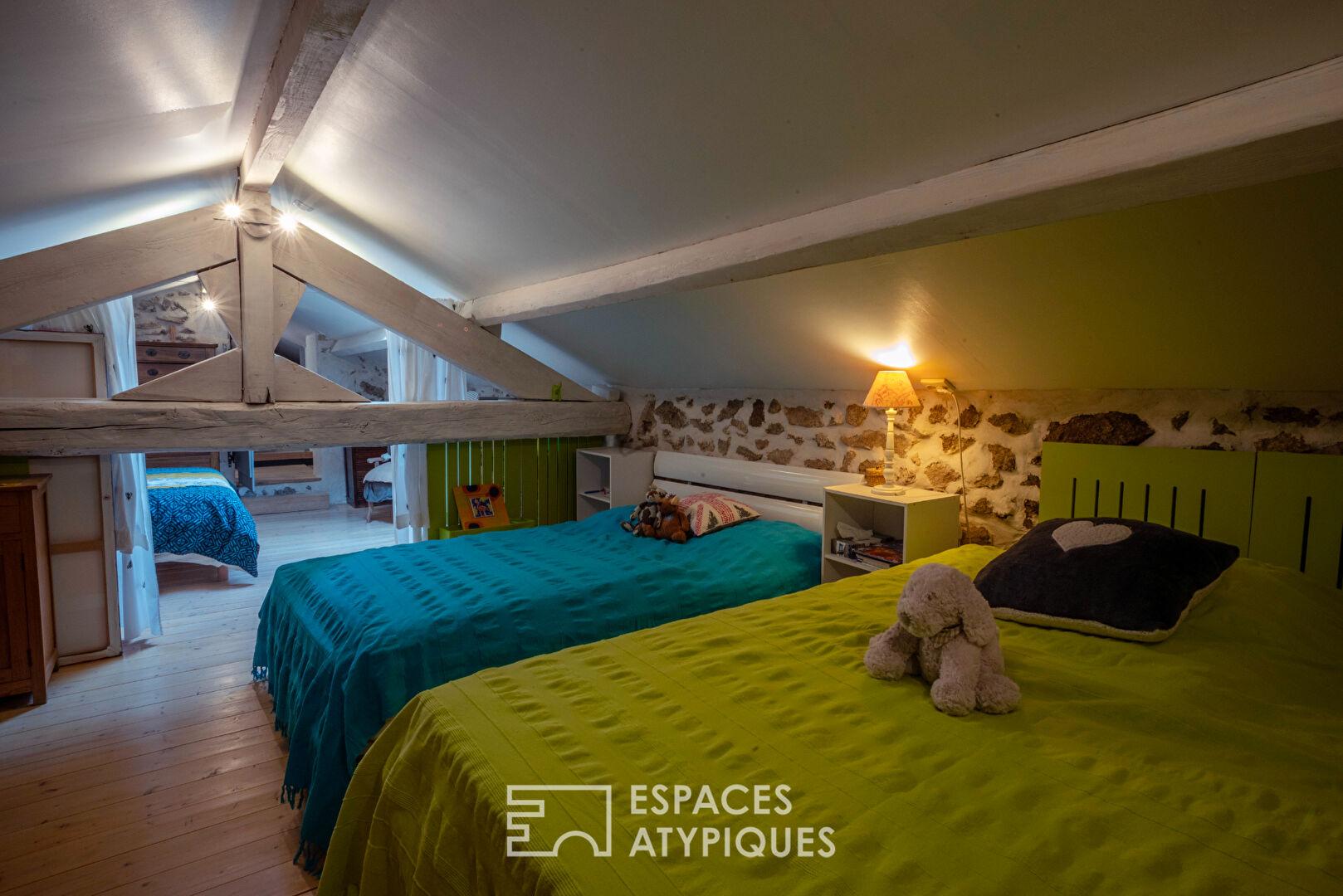 Au dernier étage accessible par un élégant escalier en orme, deux chambres en enfilade mansardées aux murs chaulés et avec parquet en sapin massif apportent une atmosphère cocooning. Un vaste grenier isolé et actuellement voué aux rangements pourra être converti en une salle de jeux pour enfants.