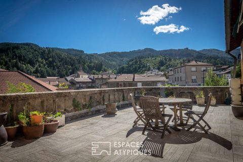 Au 1er étage un grand hall dessert une véranda ancienne, 2 chambres, une salle de bain, un salon avec cheminée, ainsi qu’un vaste espace de vie offrant une cuisine ouverte équipée, une salle à manger et un salon. Cette pièce lumineuse donne accès directement sur une terrasse de 60m2 permettant d’admirer, par dessus les toits, les crêtes verdoyantes des alentours.