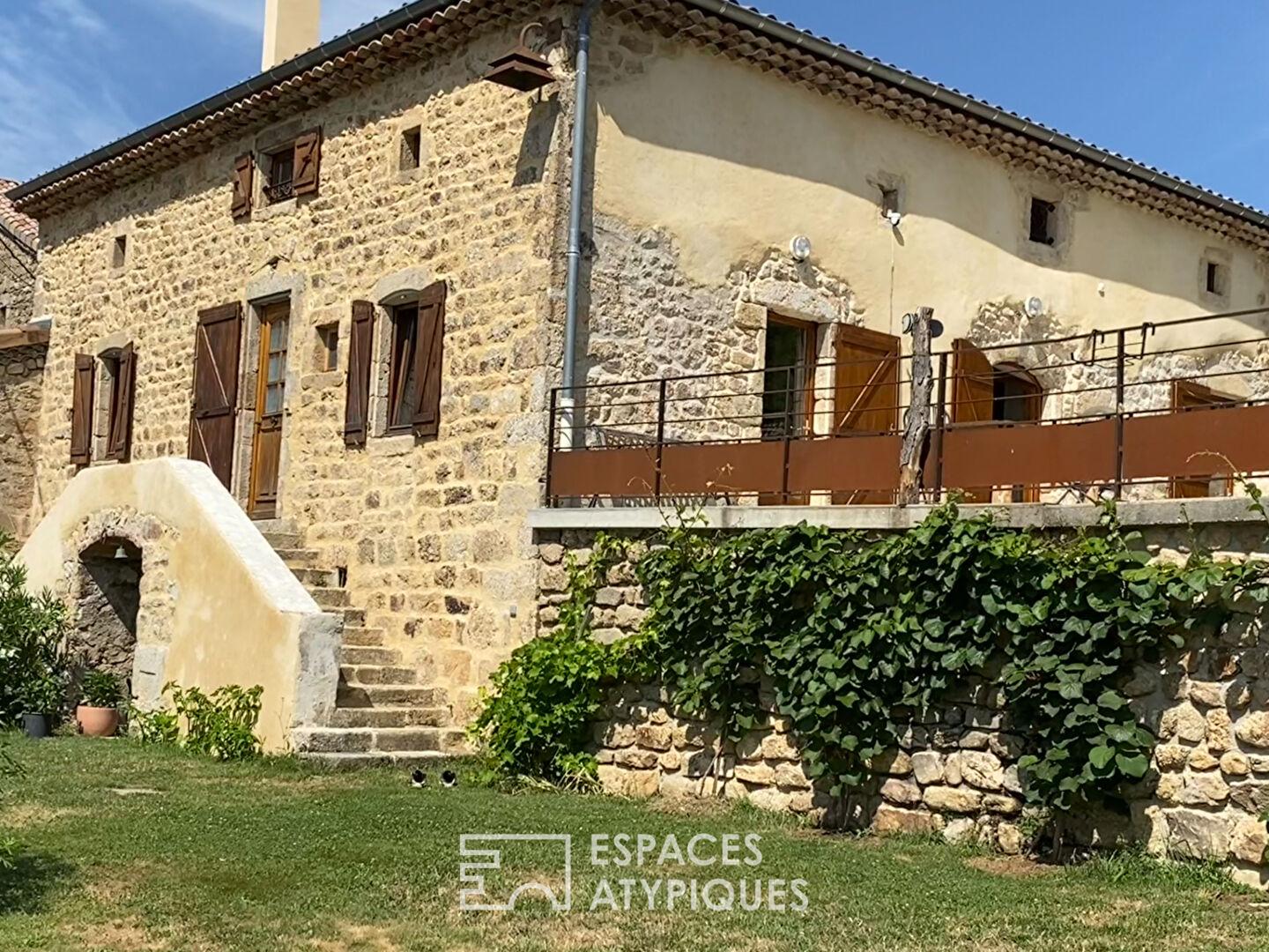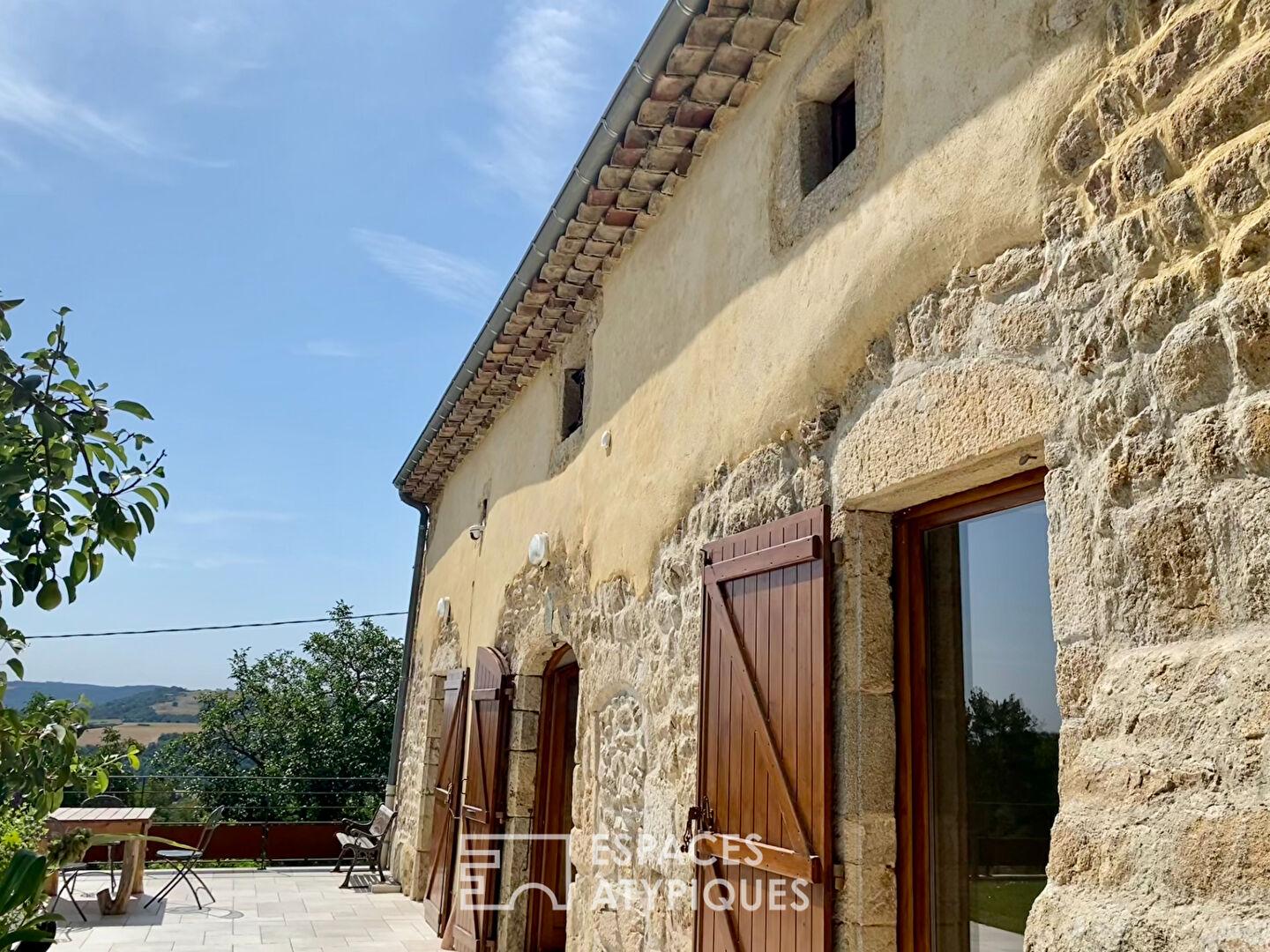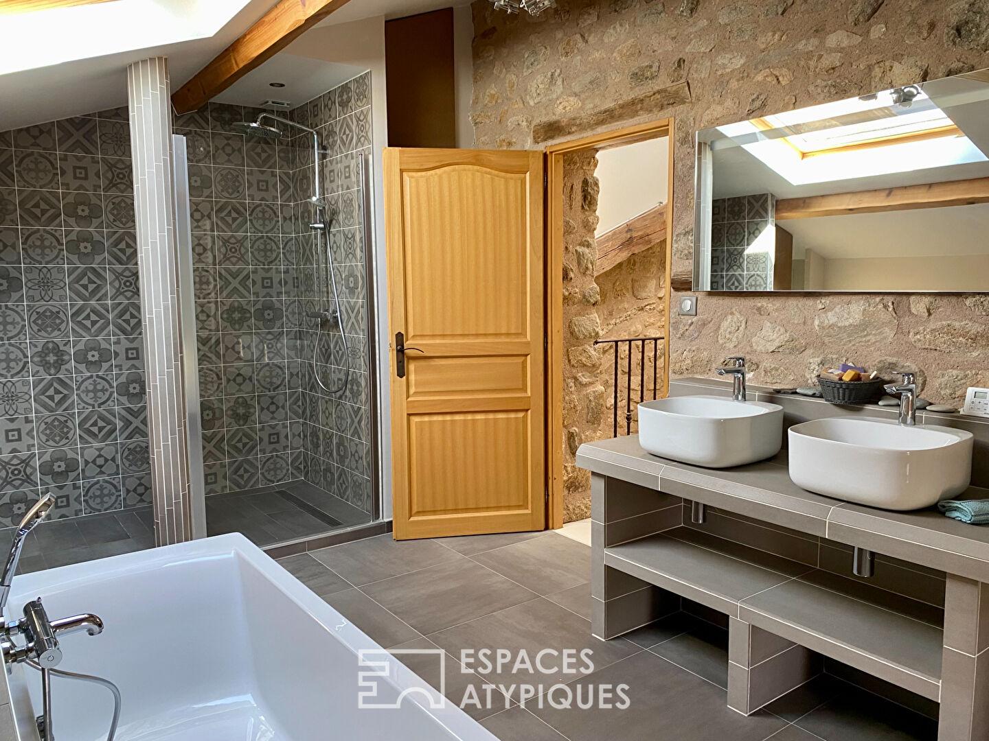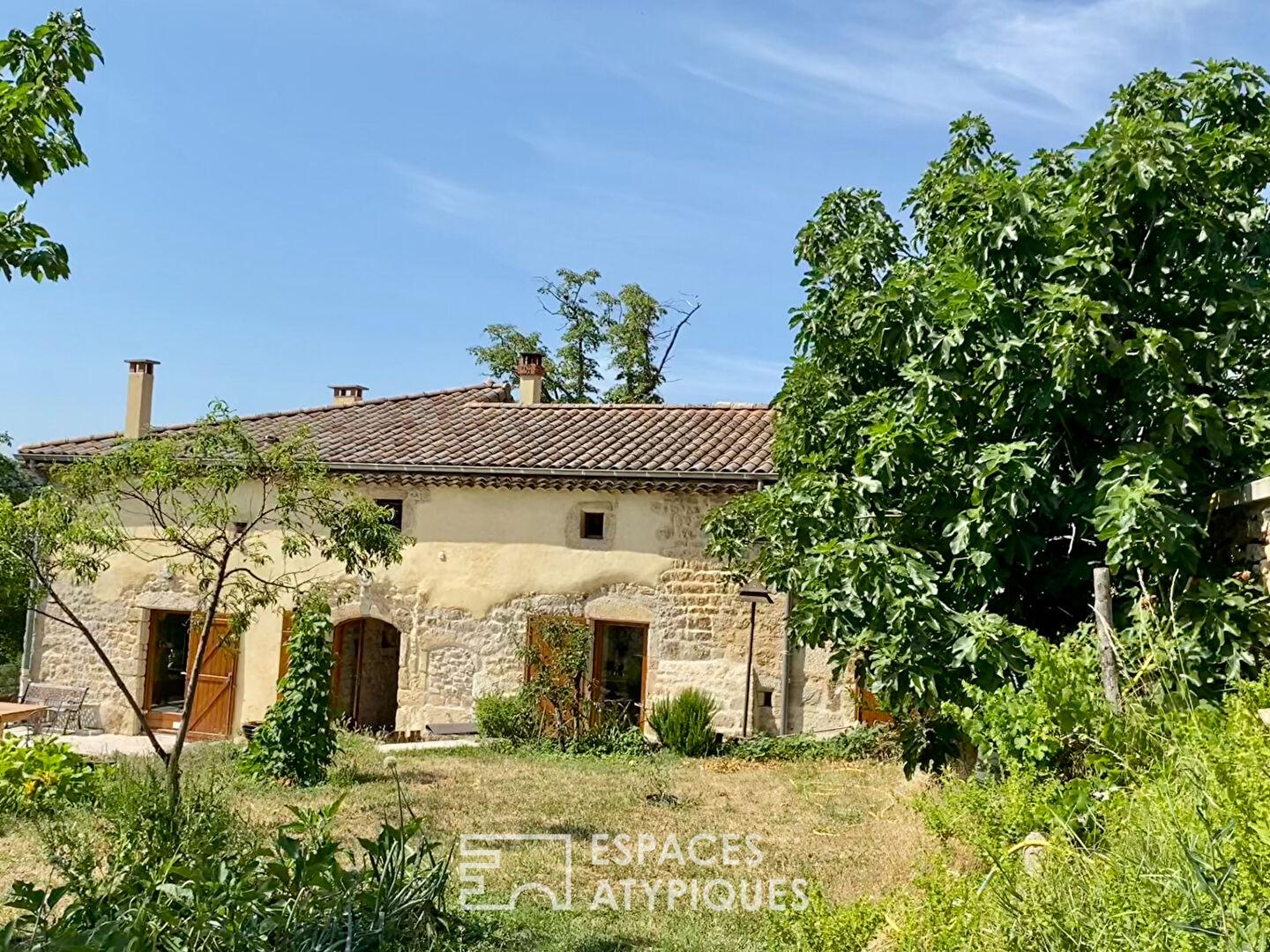 La propriété restaurée a préservé son caractère singulier, l’eau de source et ses bâtis en pierre de pays, encore enlacés par plus de 10 hectares de terres.