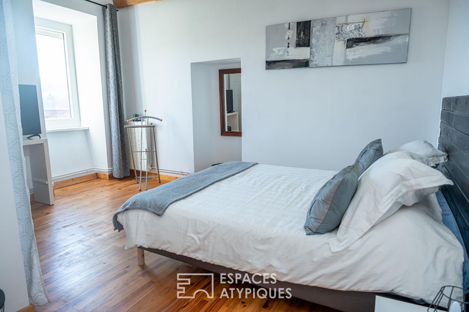 La propriété occupe 360 m² des dépendances d’un ancien domaine agricole, à 500 m d’altitude. Ses espaces, fraîchement revisités, se dressent entre une discrète cour fermée et un jardin arboré offert à une vue dégagée.