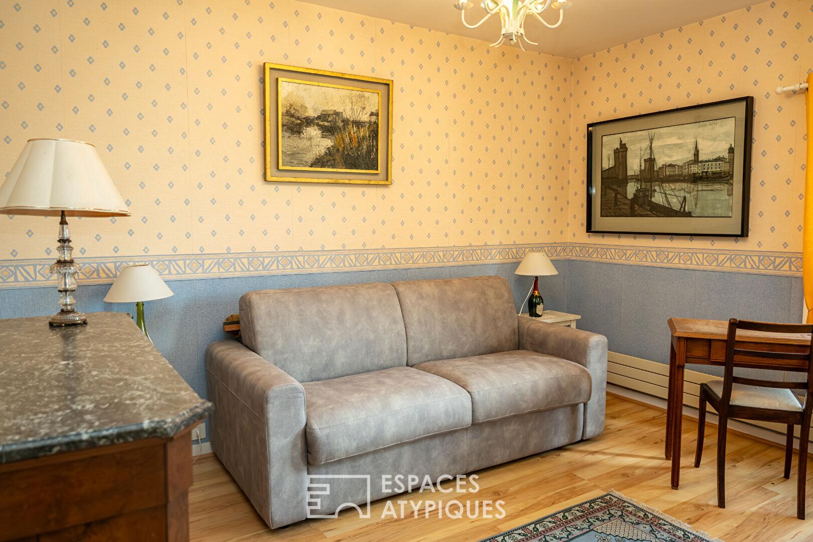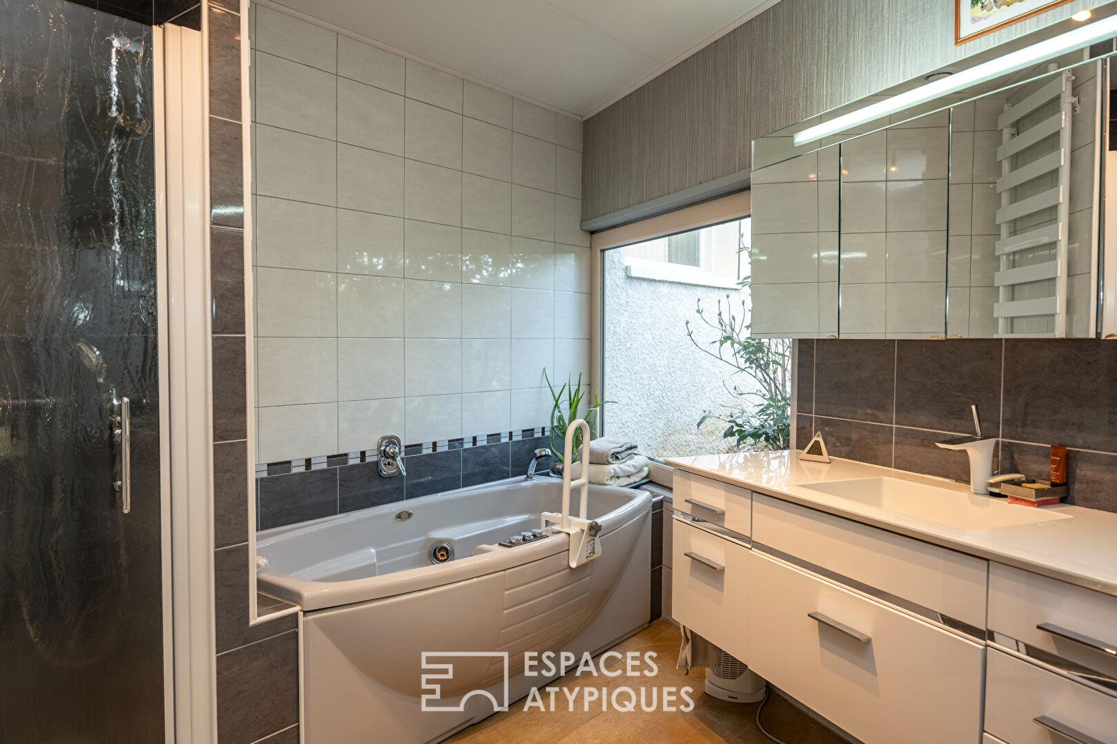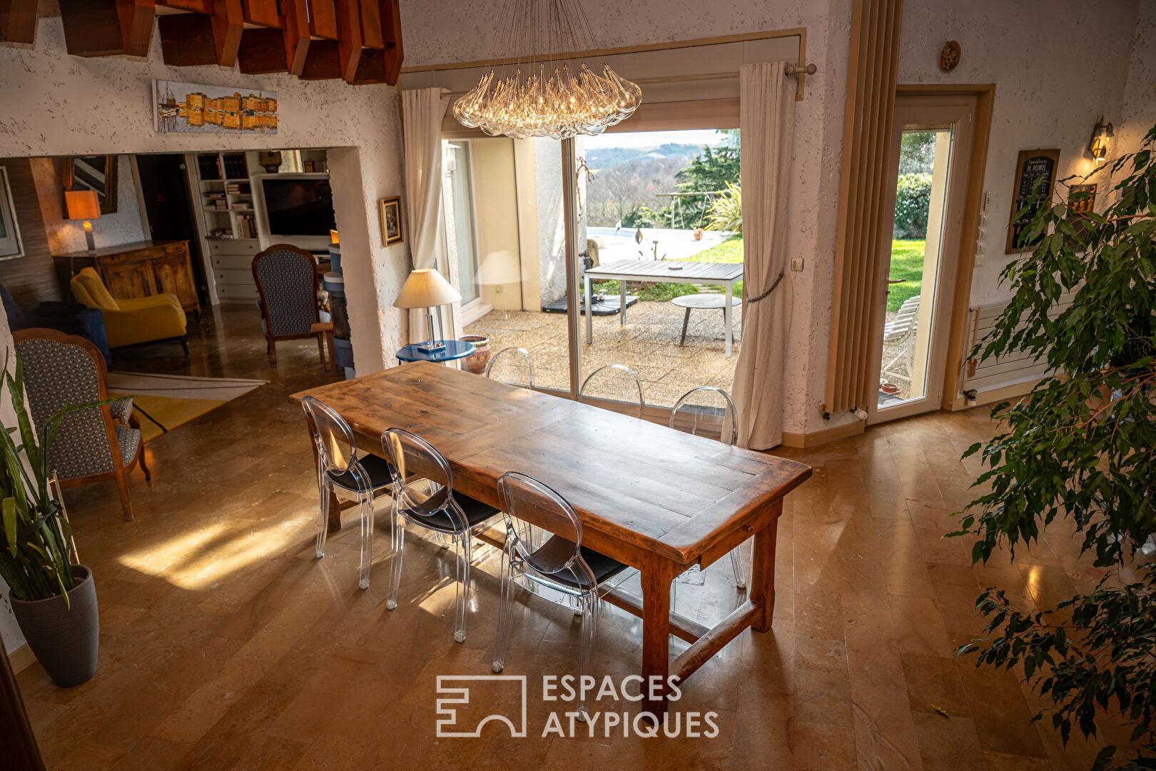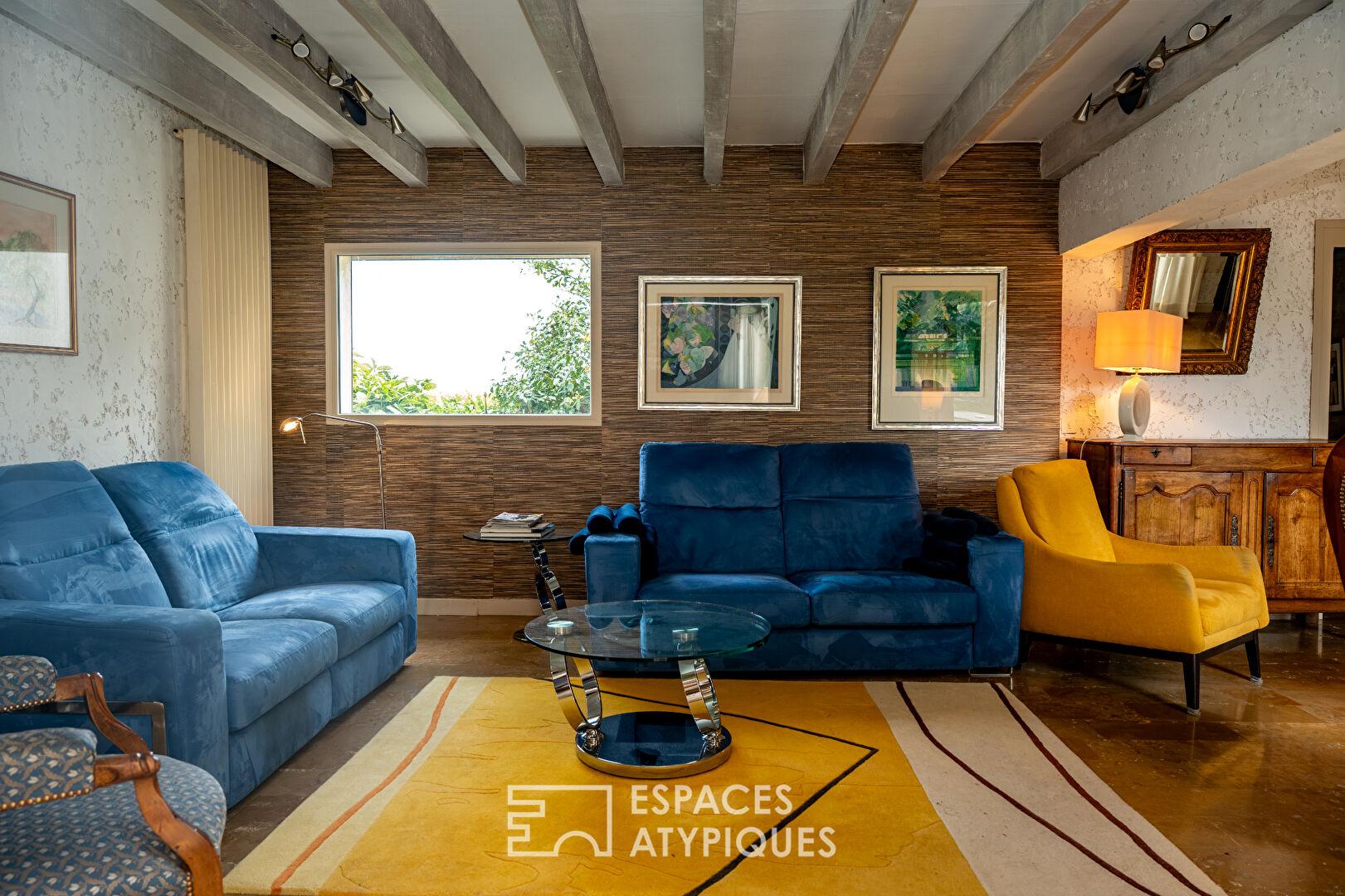L’habitation a conservé son style vintage, pour épouser une structure atypique offerte à la nature et répondre aussi bien à des contraintes de dénivelés que de pans coupés.