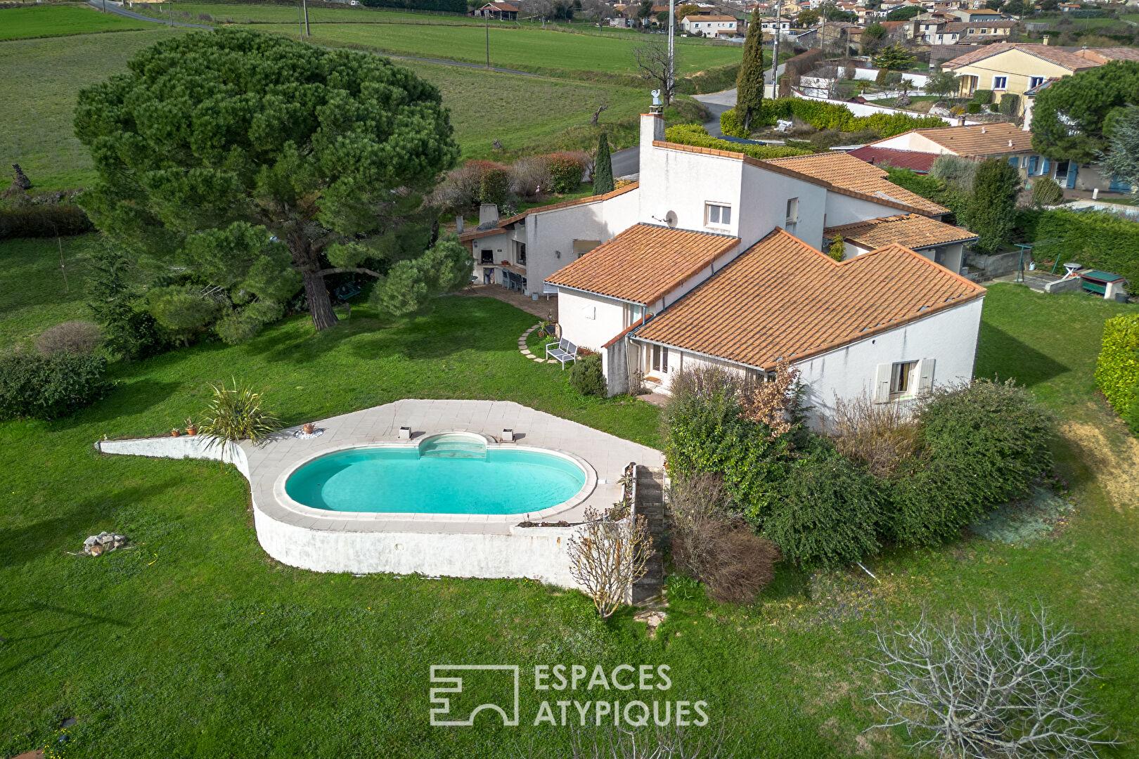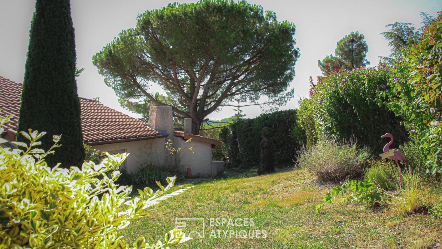 Cette solide construction, accueille alors un habitat de 156 m², majoritairement déployé en rez-de-jardin, baigné par la lumière du Sud et orienté sur un remarquable panorama.