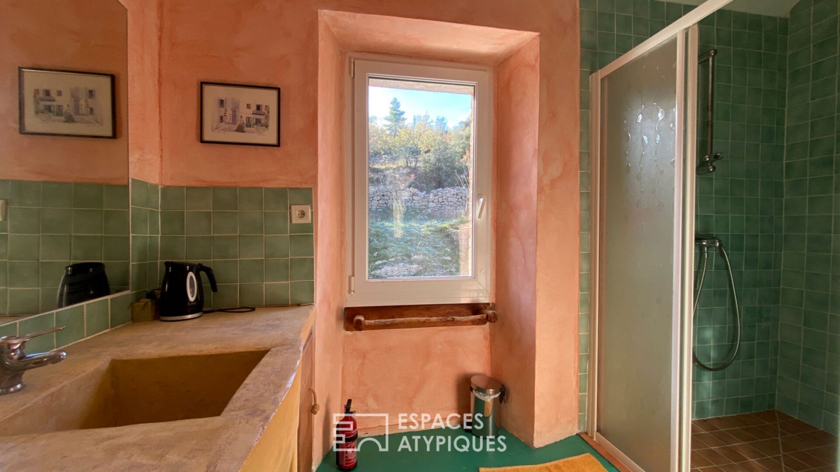 Les extérieurs ne sont pas en reste bien au contraire puisque la propriété peut compter sur 26000 M2 de terrain. Quatre restanques surplombent l’habitation et accueillent chênes, fragons, oliviers et cades. On imagine aisément la plantation d’oliviers ou de chênes truffiers sur les terrasses combinée à une activité d’accueil touristique type yourte sur les parties planes.