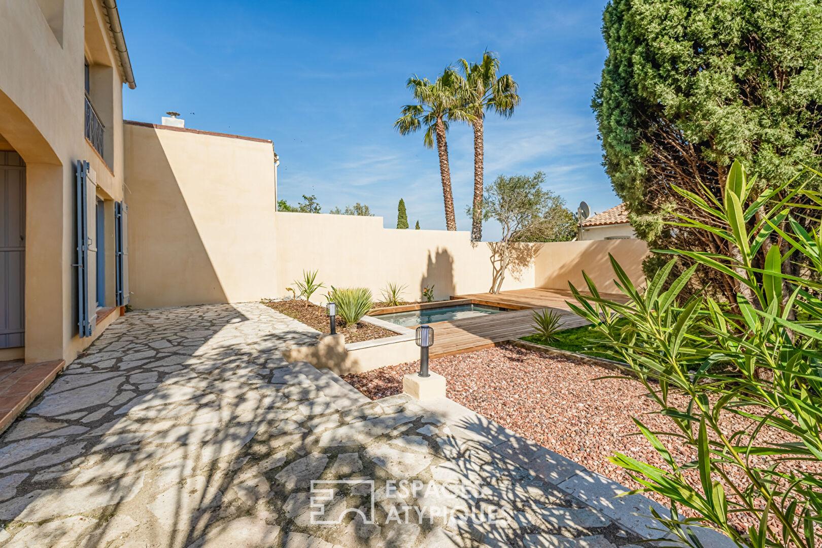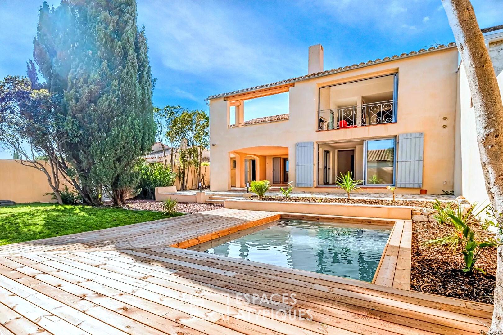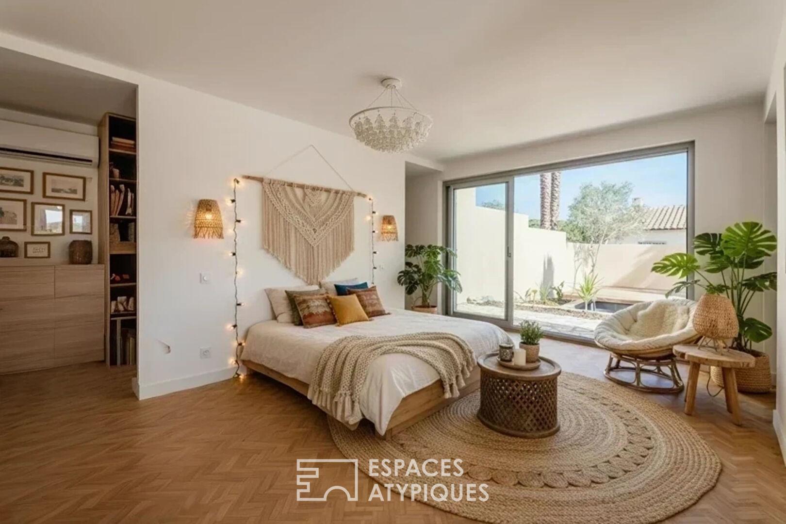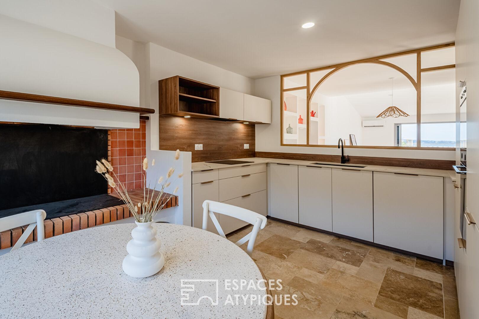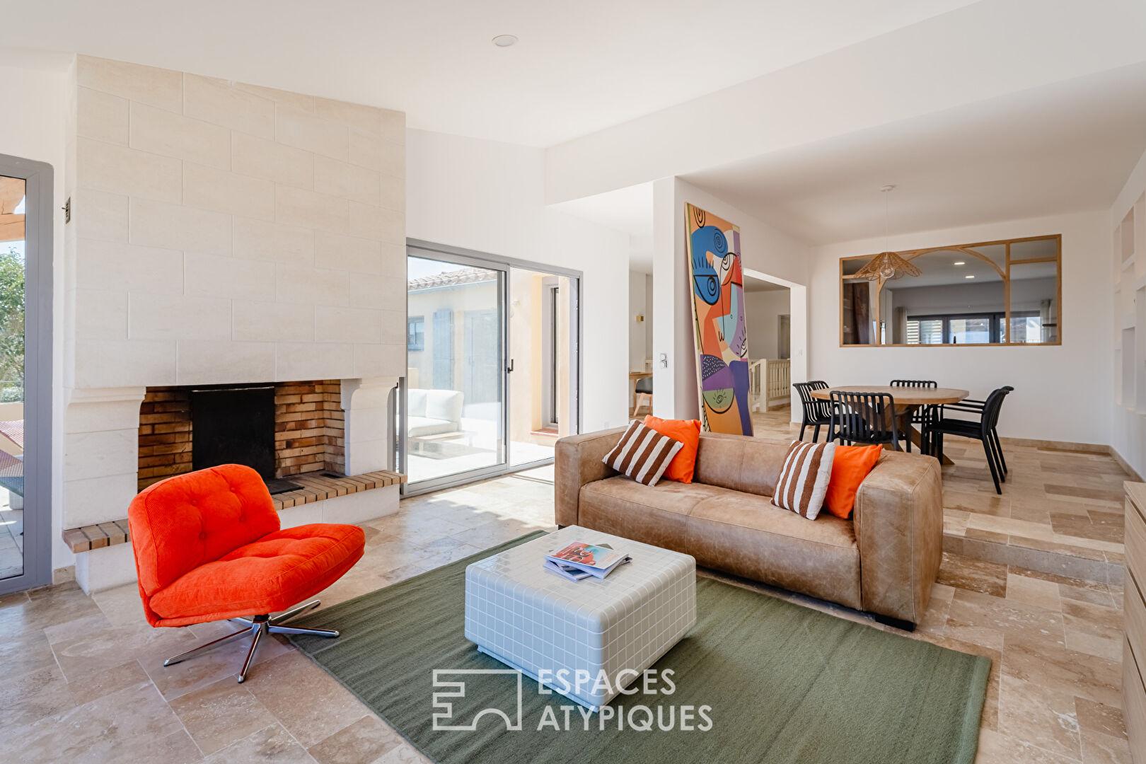 Surplombant le décor pittoresque du village de Bages, cette demeure magistrale de plus de 200 m² s’affirme comme une interprétation contemporaine et raffinée de l’art de vivre méditerranéen. Entièrement réinterprétée avec exigence, la propriété s’érige sur une parcelle d’environ 450 m², offrant un dialogue permanent entre le charme originel du bâti et une rénovation aux prestations de haute lignée.