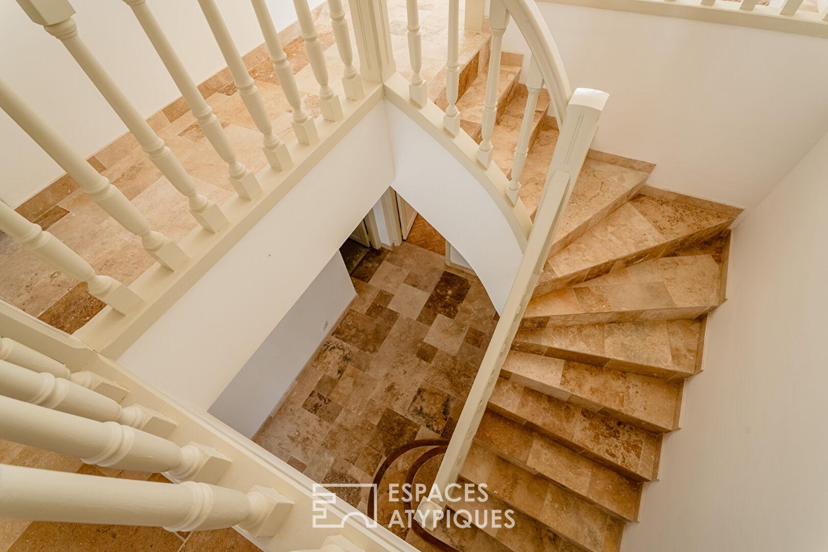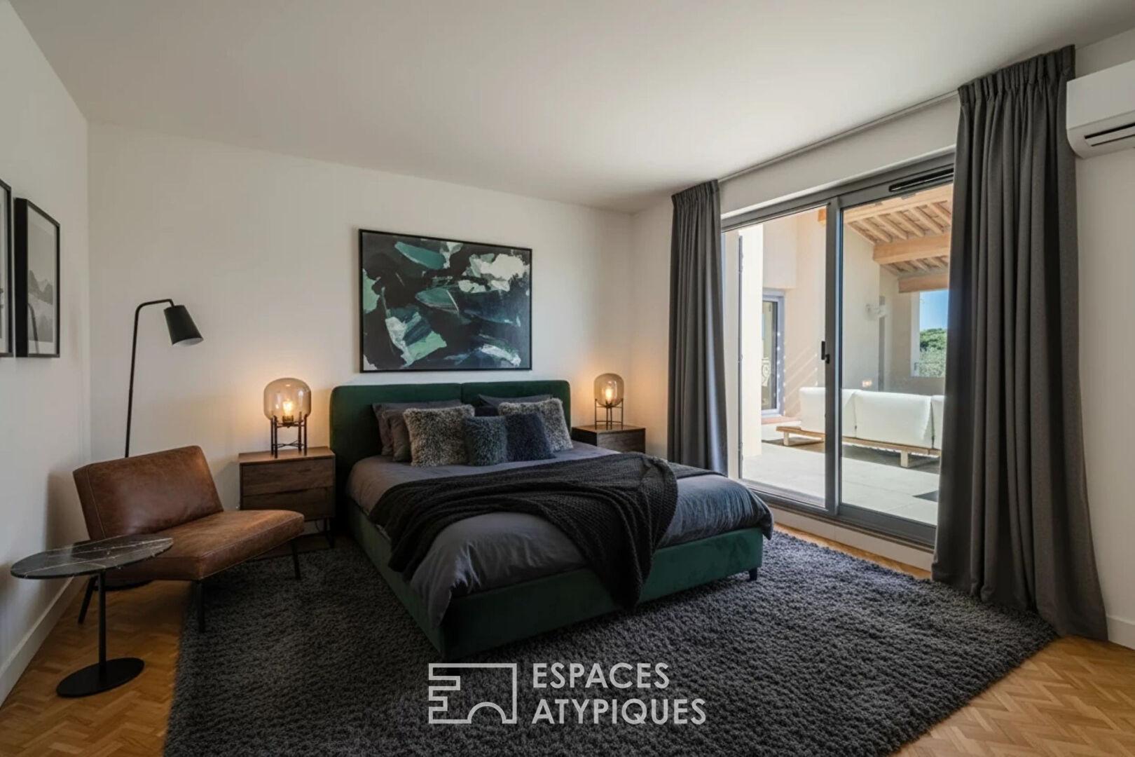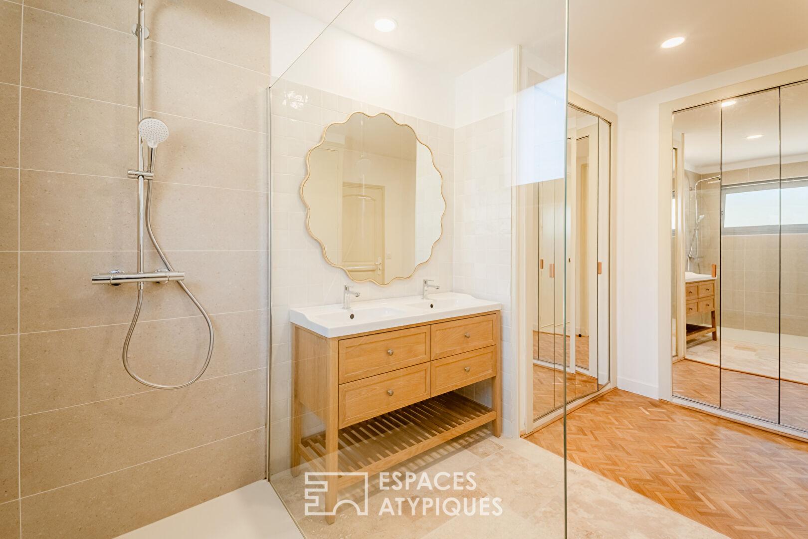Une envolée de marches dévoile une troisième chambre avec salle d’eau privative et une quatrième chambre avec salle d’eau séparée. Chaque détail, des matériaux nobles aux finitions précises, souligne le caractère exclusif de cette réhabilitation.