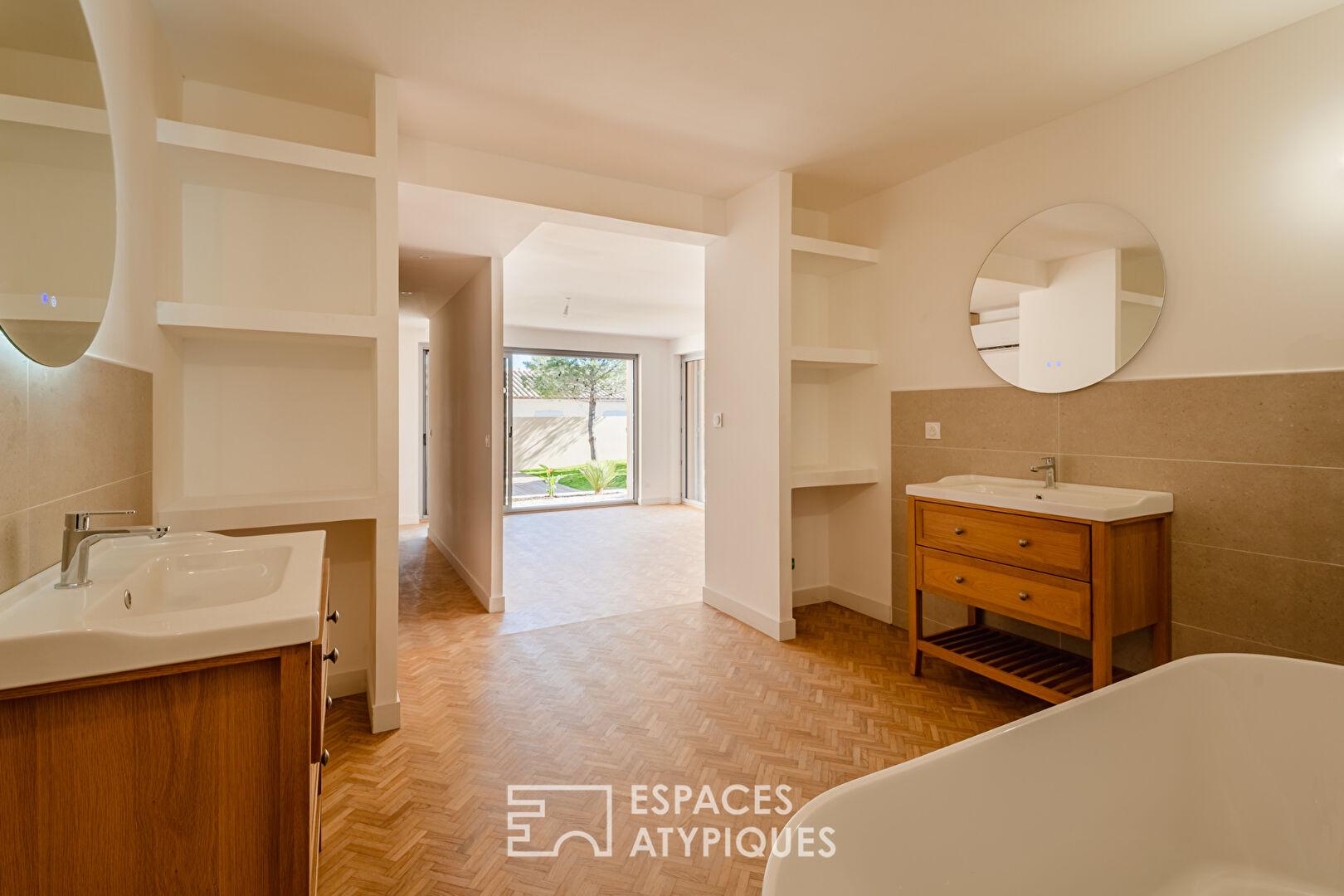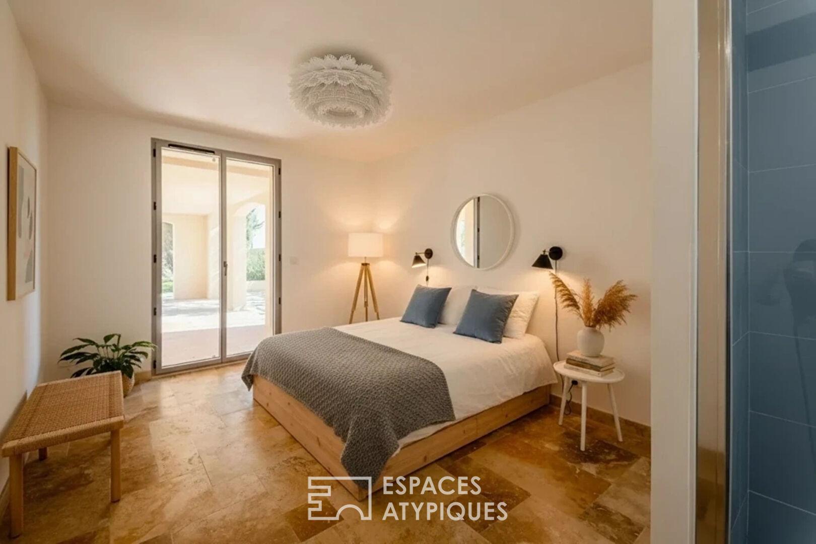 L’espace nuit a été pensé comme une suite de refuges intimes et confidentiels. En rez-de-jardin, une suite master magistrale s’érige en véritable sanctuaire de bien-être, dotée de son propre dressing et d’une salle de bains complète, tandis qu’une seconde suite parentale vient parfaire le confort de ce niveau. Ces deux chambres d’exception s’ouvrent généreusement sur plusieurs espaces terrasses, invitant à un dialogue immédiat et apaisant avec l’extérieur.