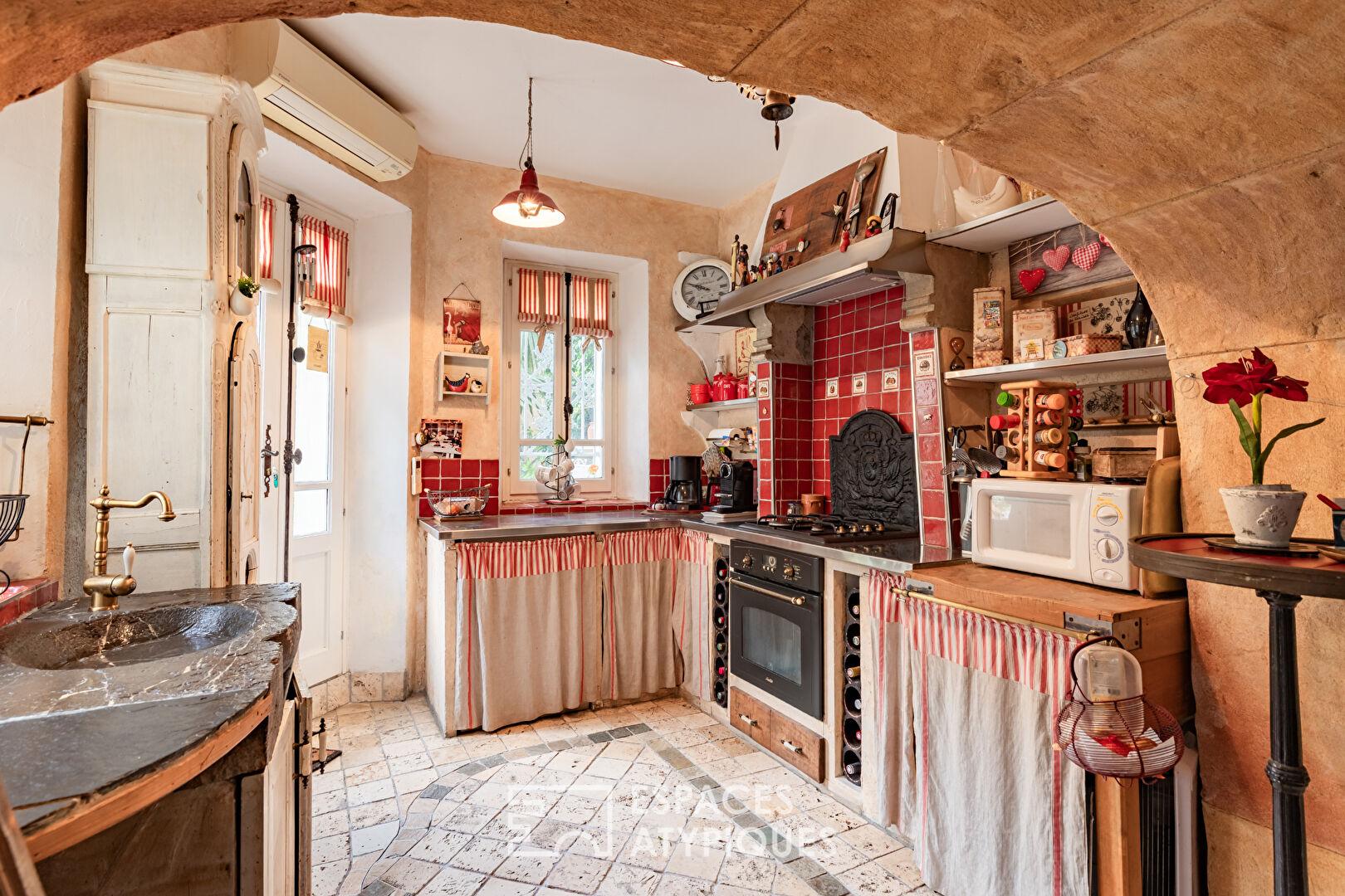 Dans son prolongement, la salle à manger s’ouvre sur un espace de vie chaleureux, structuré autour d’une cuisine de caractère, sublimée par un évier ancien en ciment, véritable signature du lieu.