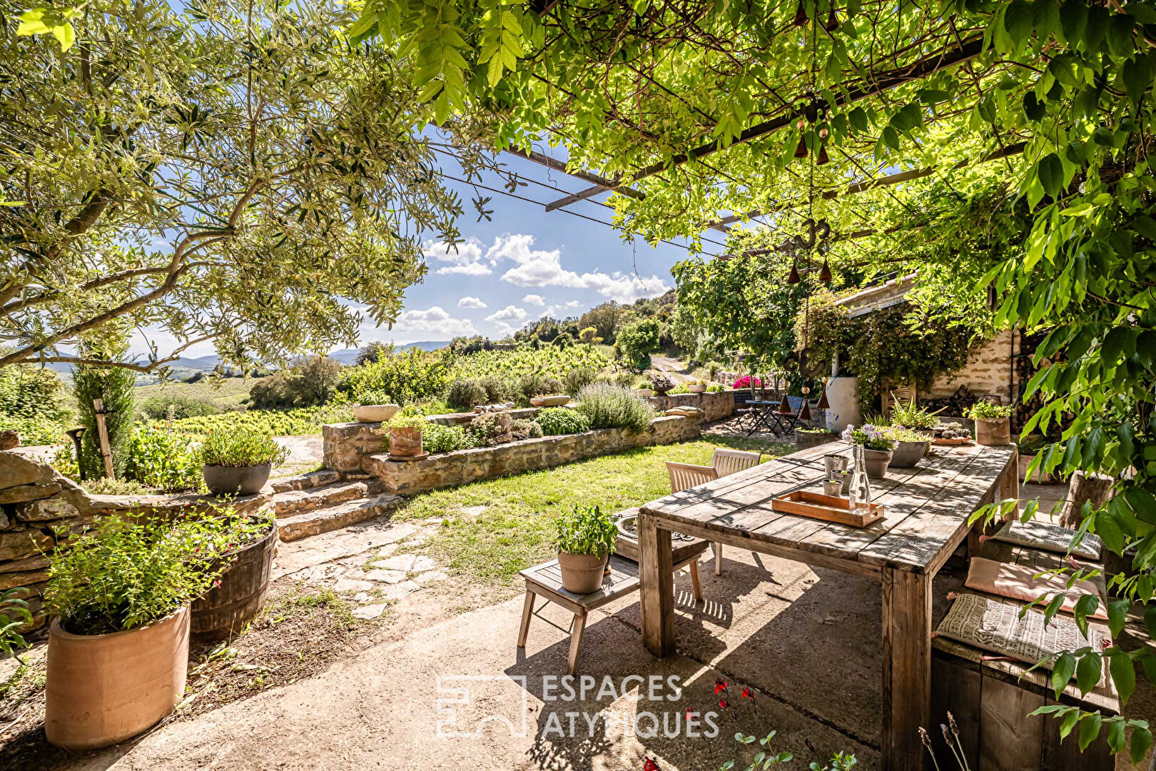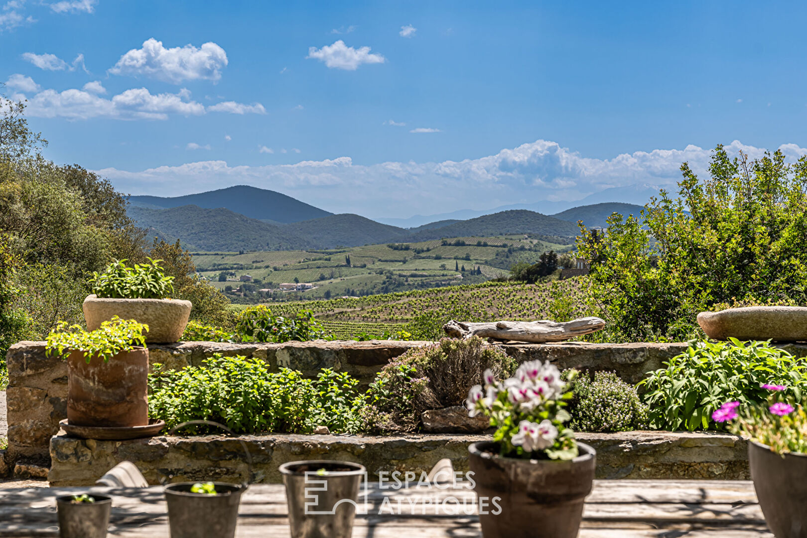 L’ancienne bergerie totalement revisitée abrite une cuisine fonctionnelle et sur mesure d’environ 40 m2, entièrement aménagée pour l’art de vivre et équipée d’un poêle à bois et d’un four à pain, s’ouvrant sur une belle terrasse ombragée avec vue dégagée sur les vignes et les Pyrénées Orientales.