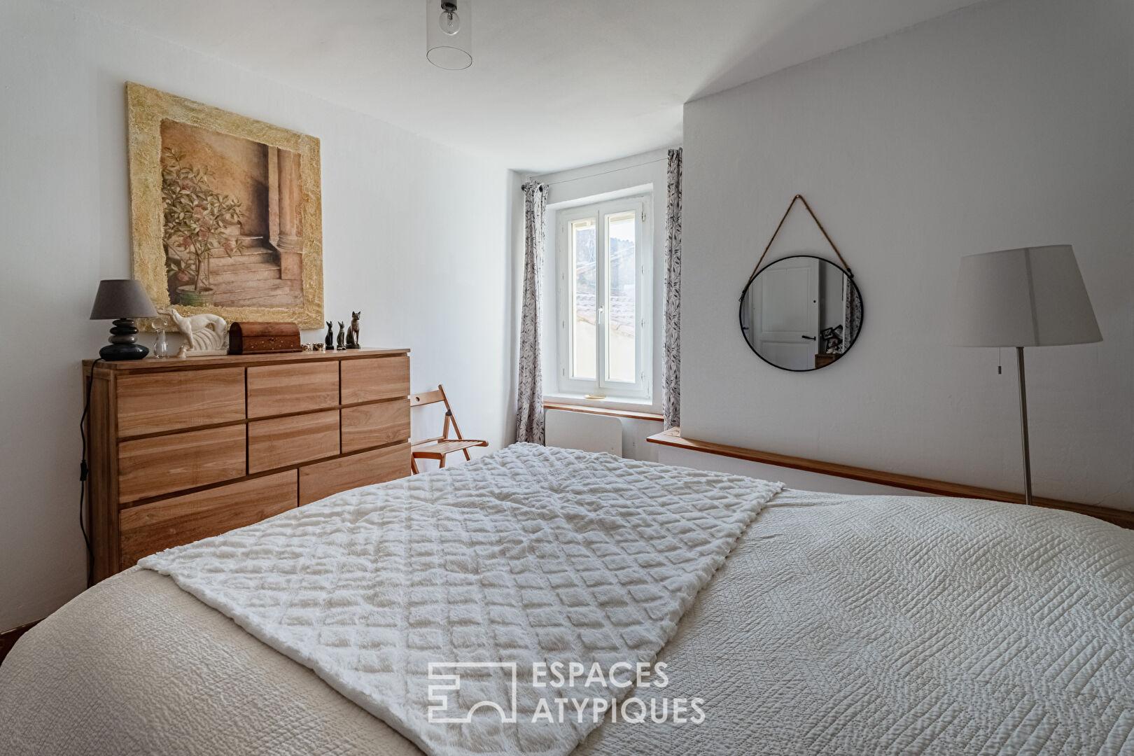 L’espace nuit principal comprend une chambre confortable et une salle de bain entièrement rénovée. À l’étage, une seconde chambre mansardée propose un espace polyvalent, idéal en chambre d’appoint, bureau ou espace détente.