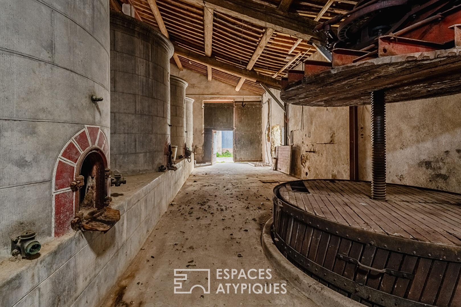 Le bâtiment séduit par son authenticité et ses volumes généreux. L’espace intérieur est marqué par la présence d’anciennes cuves viticoles en béton de 4 mètres de large, éléments architecturaux forts offrant de multiples possibilités d’aménagement (chambres atypiques, espaces techniques ou alcôves de vie).