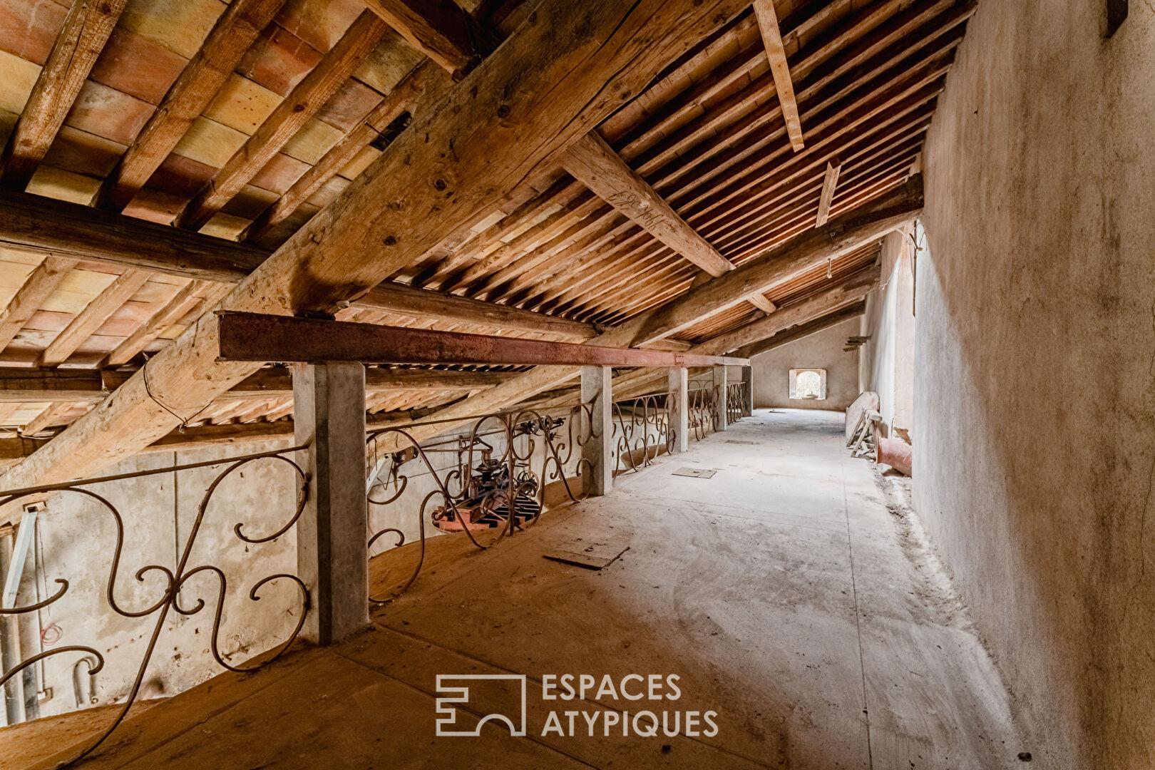 Une vaste mezzanine de 20 mètres linéaires parcourt la longueur du bâtiment, structurant naturellement le futur agencement des pièces. La charpente traditionnelle et les murs en pierre soulignent le caractère historique du lieu.