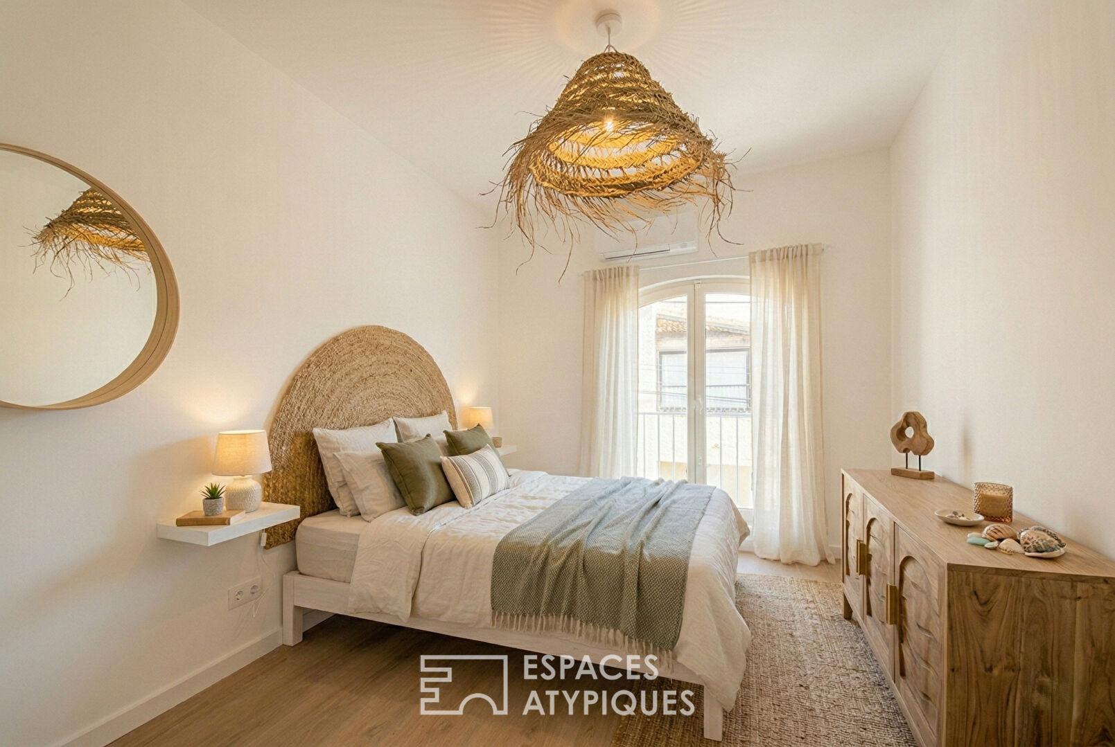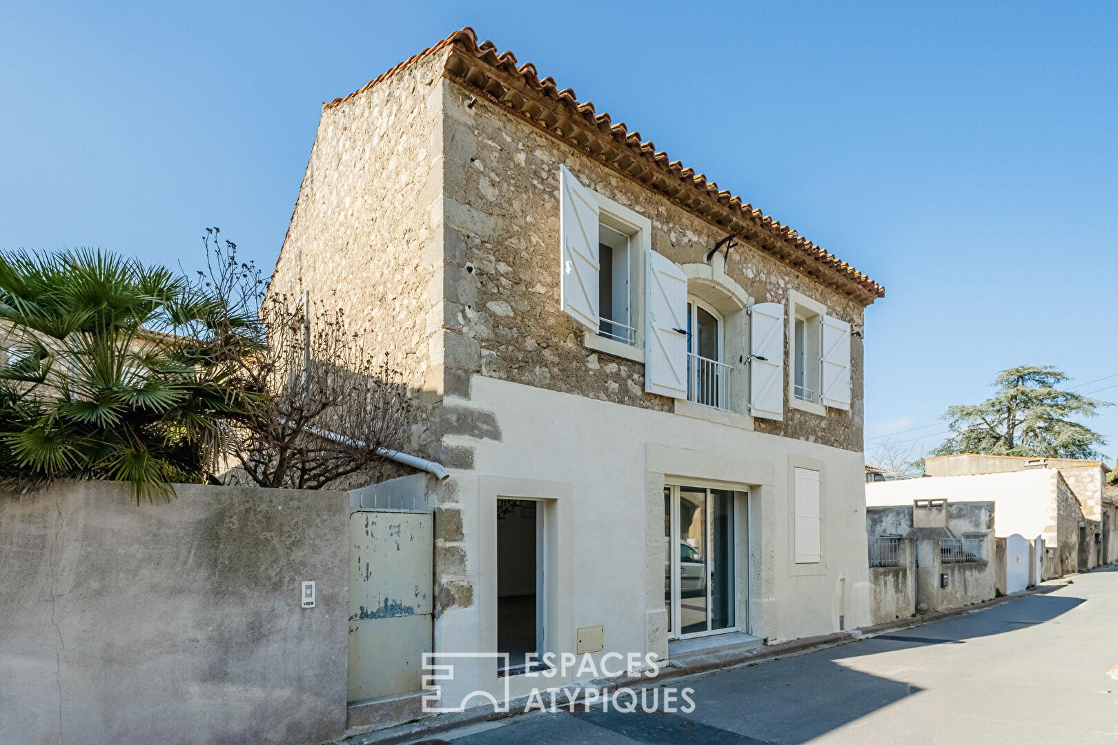 Située au coeur d’un village paisible aux portes de Narbonne, cette ancienne remise de 1900 a fait l’objet d’une métamorphose complète signée par une architecte. Alliant la noblesse de poutres centenaires à la pureté du blanc, cette habitation de caractère offre un cadre de vie serein et résolument contemporain.