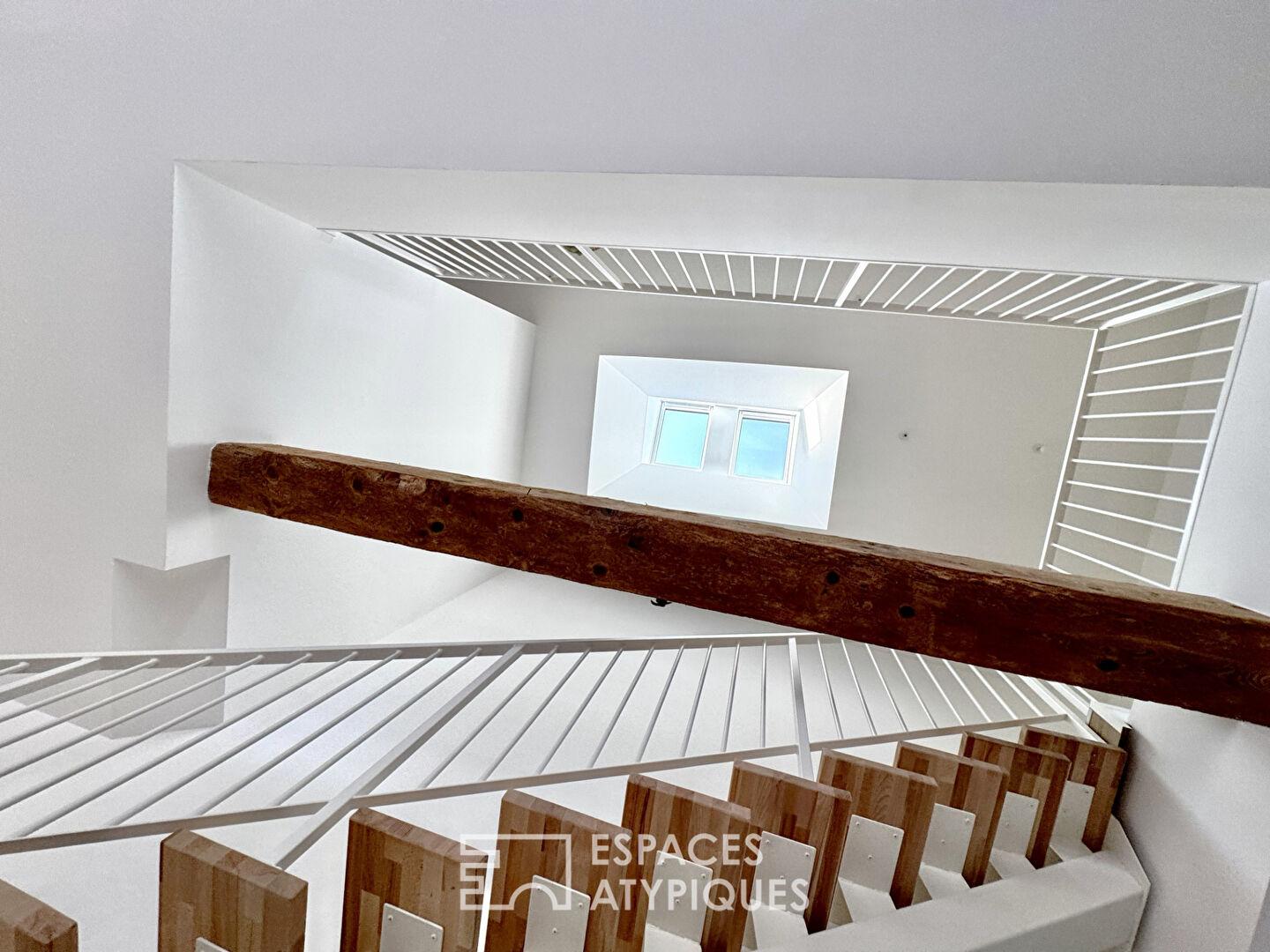Le jeu de transparences et le puit de lumière créent une sensation de volume et de clarté constante, soulignant la verticalité de l’architecture.