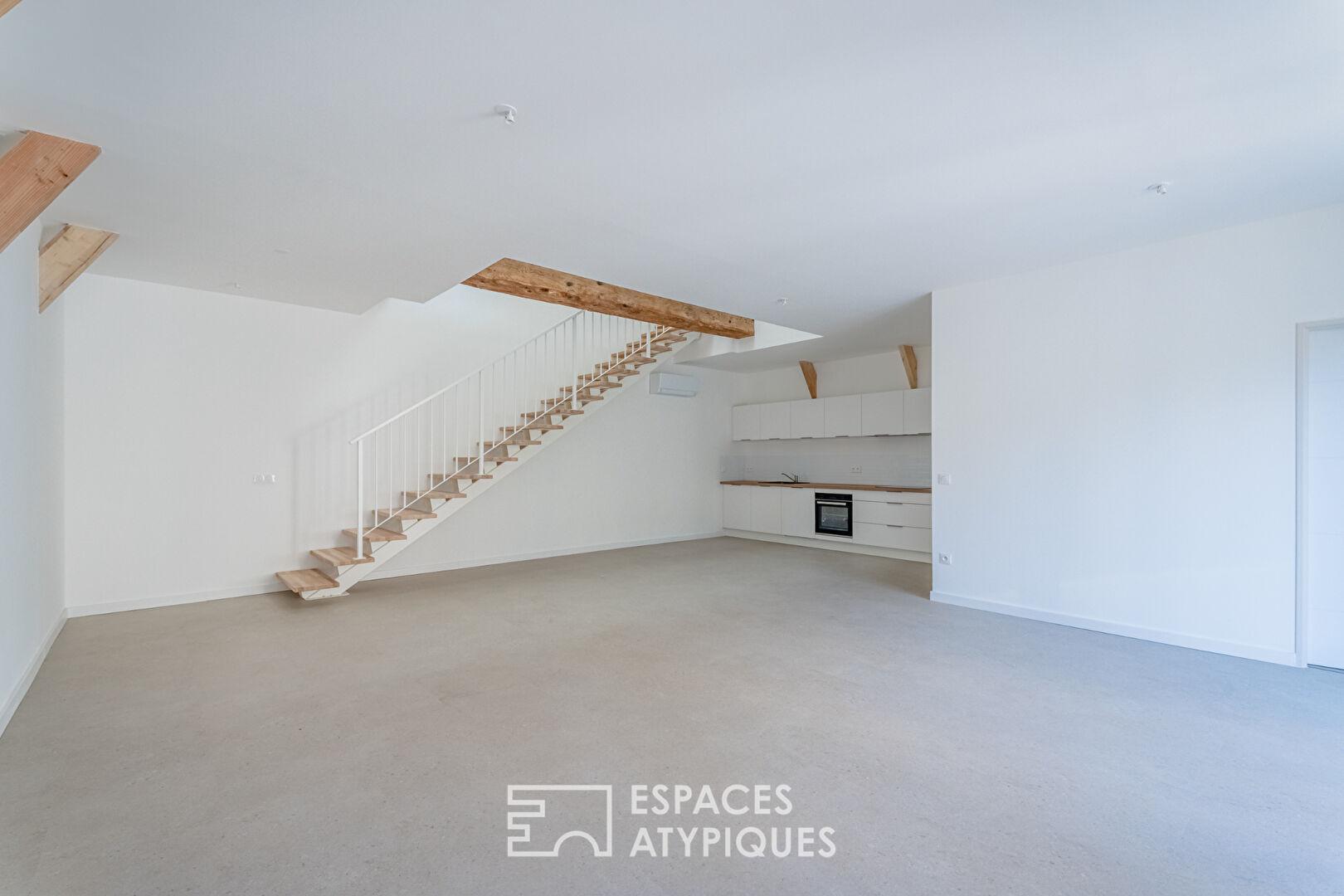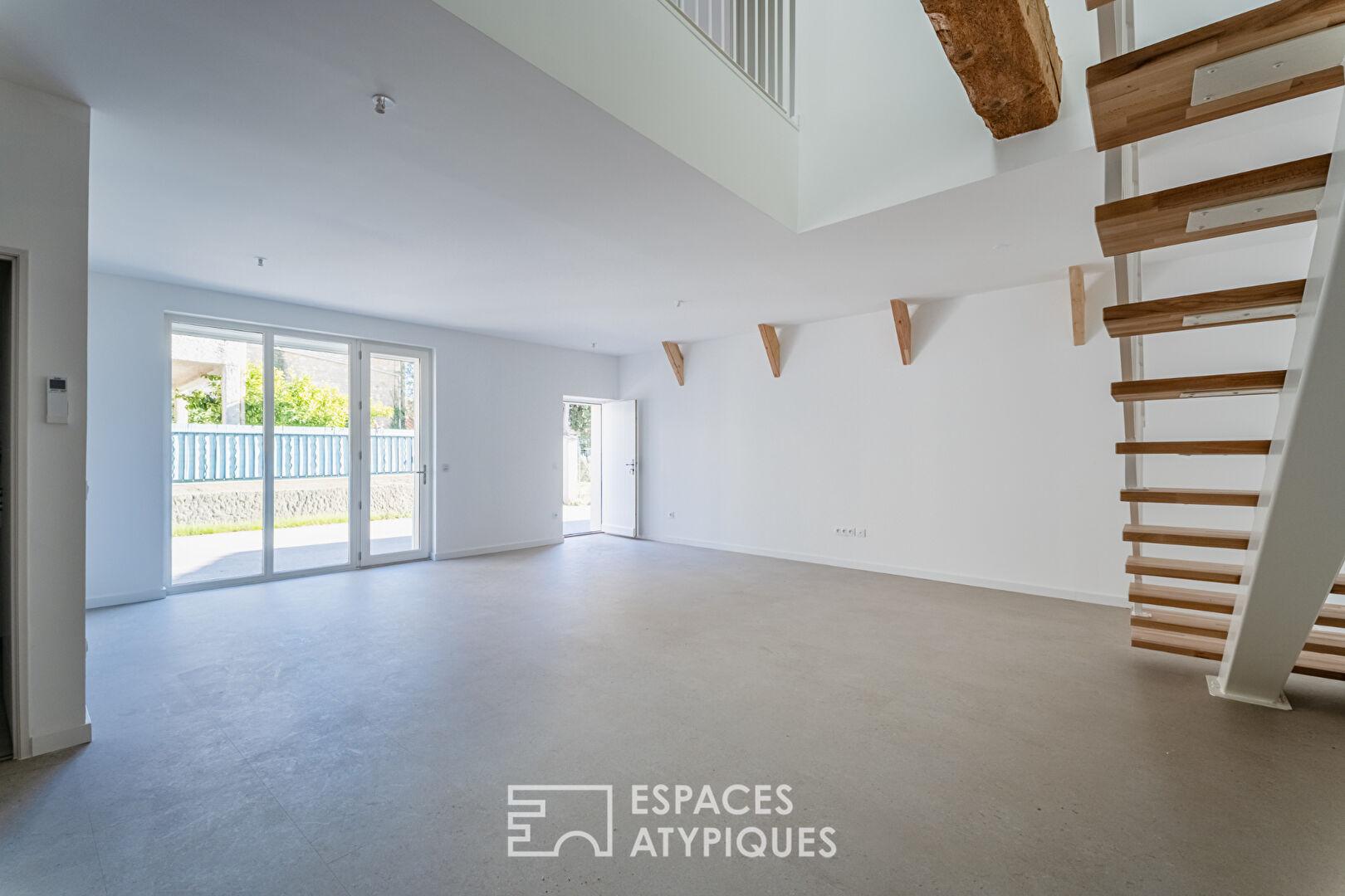 L’espace de vie s’articule autour d’un vaste séjour baigné de lumière naturelle, où les structures d’origine apportent un cachet authentique. Le design intérieur, doux et épuré, privilégie une circulation fluide vers la cuisine moderne.
