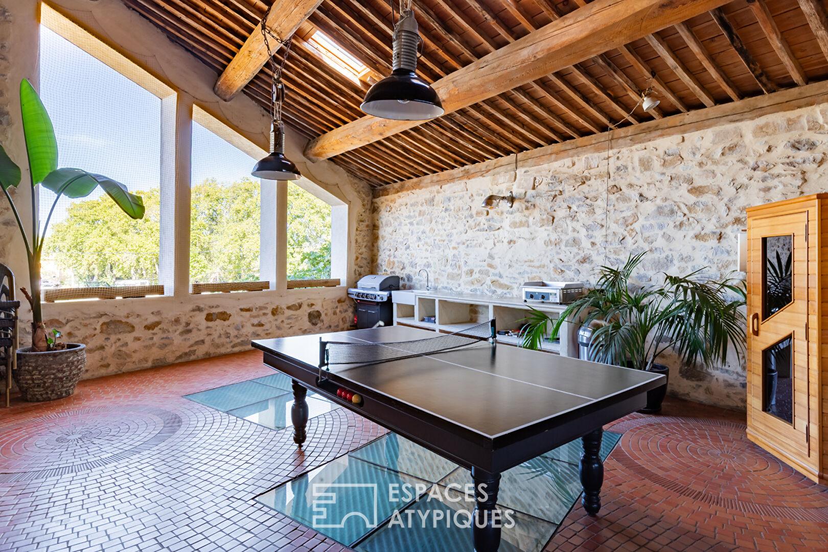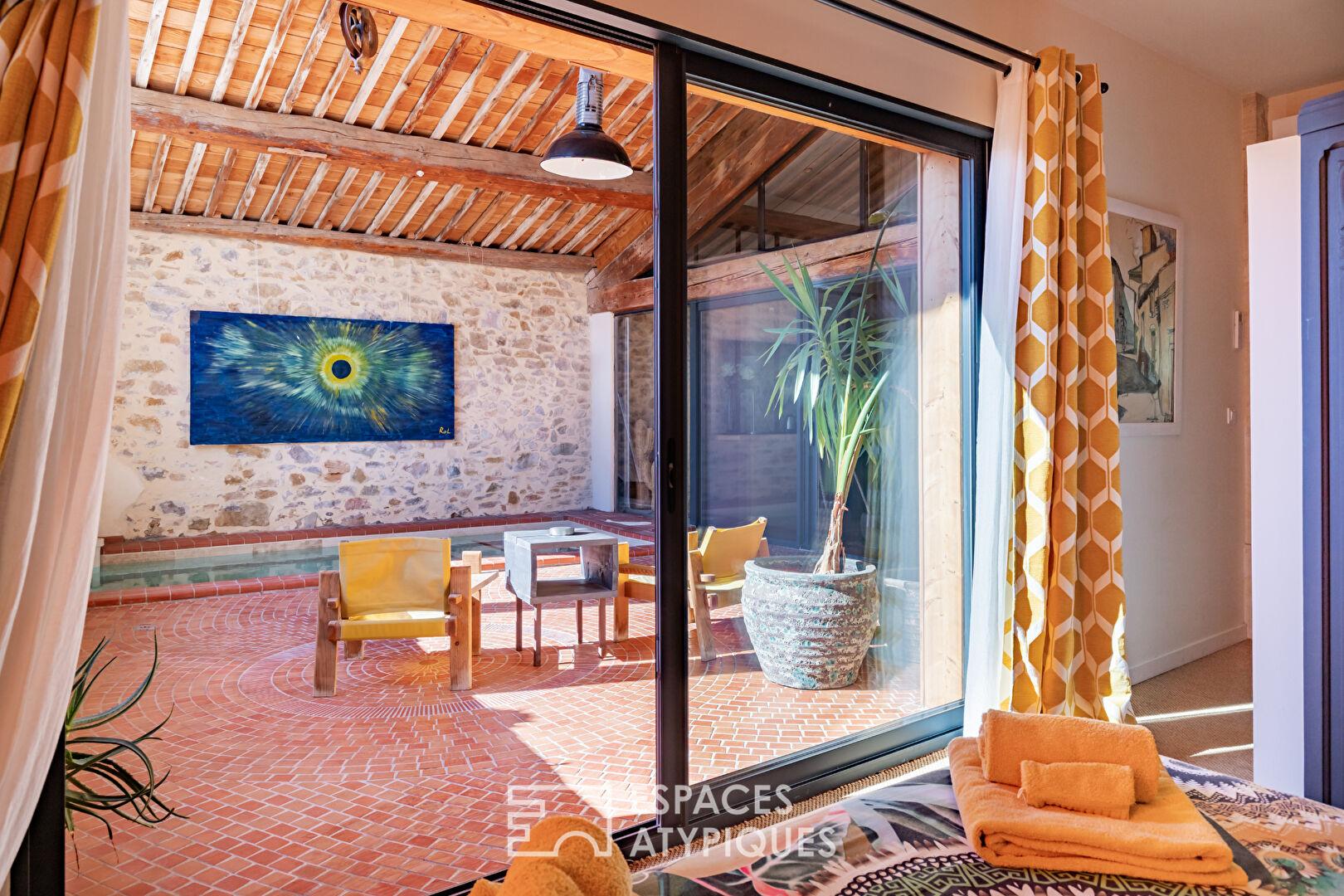 Dans un cadre paisible à deux pas du canal du Midi, cet ensemble immobilier de 375 m² conjugue esprit artistique, volumes exceptionnels et ambiance singulière. Pensé comme un lieu de vie hybride, il réunit galerie d’art, résidence principale et hébergement haut de gamme, dans une cohérence architecturale rare.